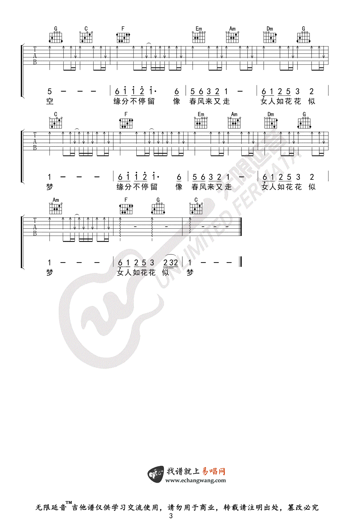 《梅艳芳《女人花吉他谱》(C调)》内容来自于互联网,不能保证内容的准确性与完整性,仅供学习交流欣赏,请勿用于其它用途,内容版权归原作者及来源网站所有,如有侵犯到您的权益请来信告知,我们将及时删除。