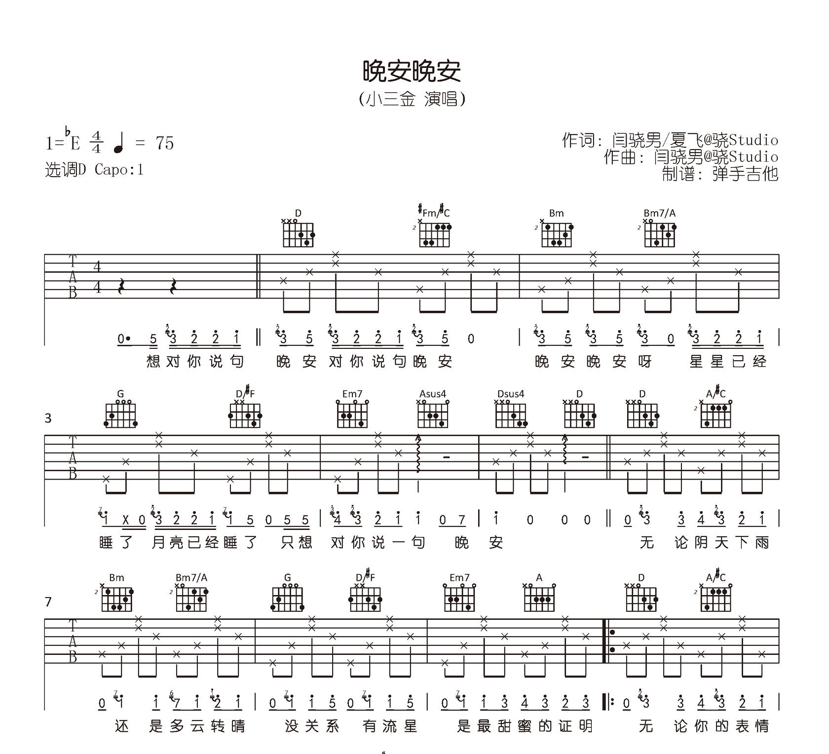 《晚安晚安》吉他谱呈现了一首温柔至极的歌曲,以D调指法为基础,变调夹夹1品。这首小三金的作品通过吉他六线谱传达着甜蜜的情感。曲谱分为三张高清图,呈现完整版,为付费版。在学习过程中,如有疑问,可通过微信进行答疑。这首歌曲的弹唱谱为晚安晚安,贴近人心,令人感受到浓