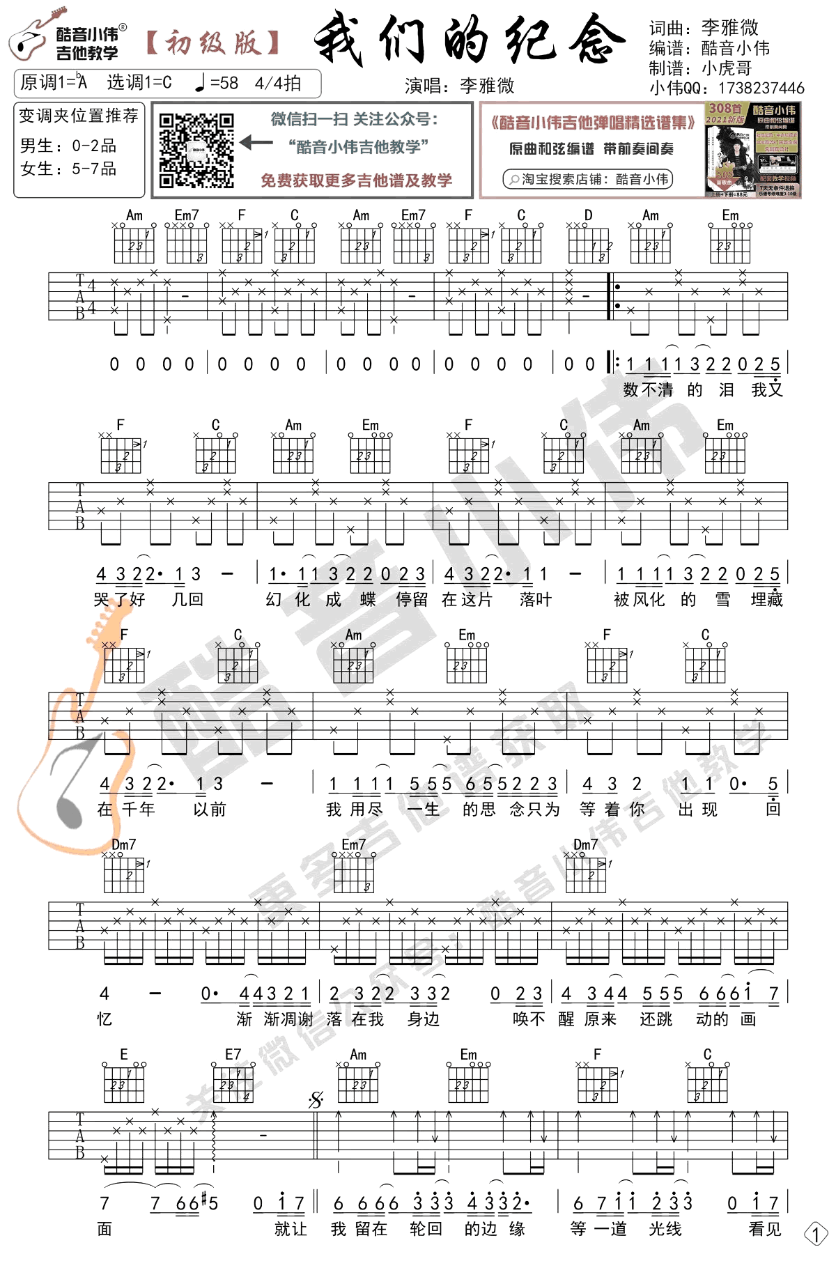 《李雅微《我们的纪念吉他谱》(C调)》内容来自于互联网,不能保证内容的准确性与完整性,仅供学习交流欣赏,请勿用于其它用途,内容版权归原作者及来源网站所有,如有侵犯到您的权益请来信告知,我们将及时删除。