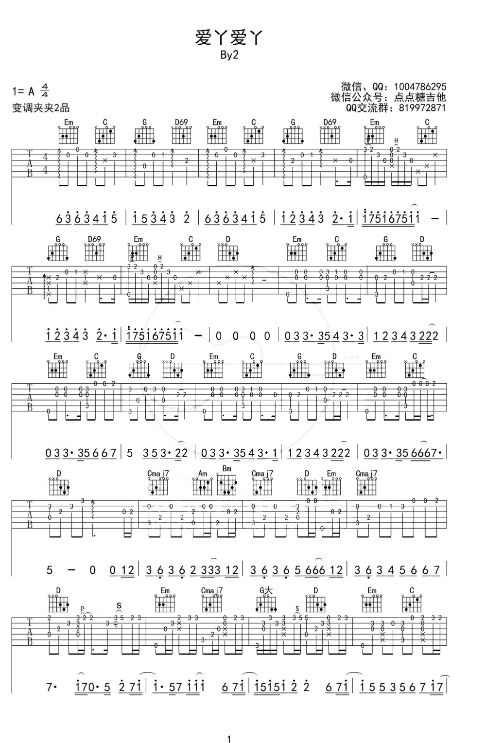这是一首改编自By2的经典老歌的吉他曲谱,《爱丫爱丫》。谱中前奏和间奏相同,弹奏时需注意琶音和打板的技巧,以避免杂音。每个音段要求平均弹奏,保持流畅过渡。特别强调在XX和数字相连的部分,除了打板还要用指尖刮出音色。副歌部分对初学者来说跨度较大,建议慢慢练习,找