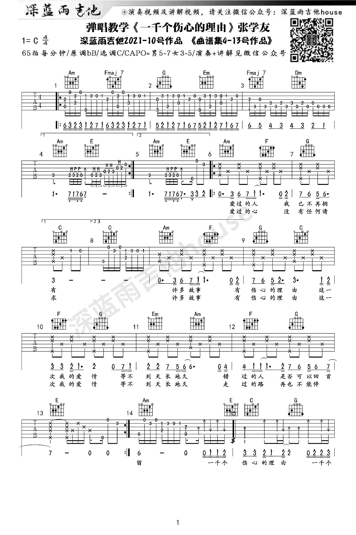 张学友的经典歌曲《一千个伤心的理由》以吉他谱形式呈现,谱中采用C调指法,原调降B,男生建议使用变调夹放在5-7品,女生则在3-5品。深蓝雨吉他提供了六线谱,并附有两张弹唱图片谱,为学习者提供了直观的指导。感谢深蓝雨吉他的制作,并提供了同步的吉他弹唱和教学视频,