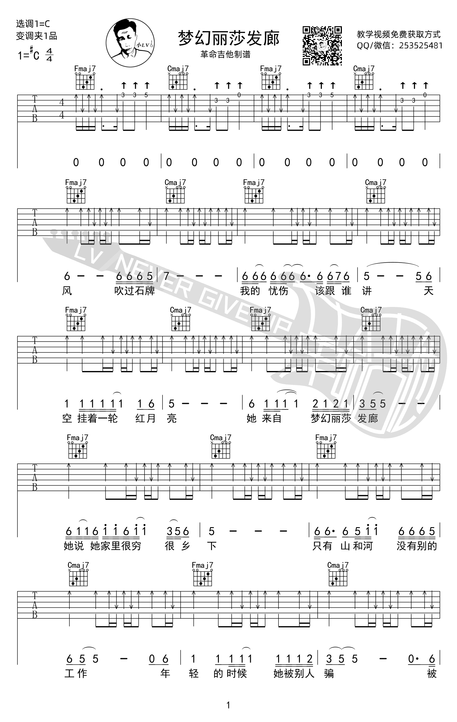 这是一首名为《梦幻丽莎发廊》的吉他曲谱,创作于五条人的音乐之中。曲谱采用C调指法,通过使用变调夹夹在一品的位置,呈现出独特的音乐风格。制谱者小LV吉他制谱用心分享,提供了四张高清图片谱,为学习者提供了清晰的视觉参考。这首曲目仿佛带领着人们走进梦幻的丽莎发廊,吉