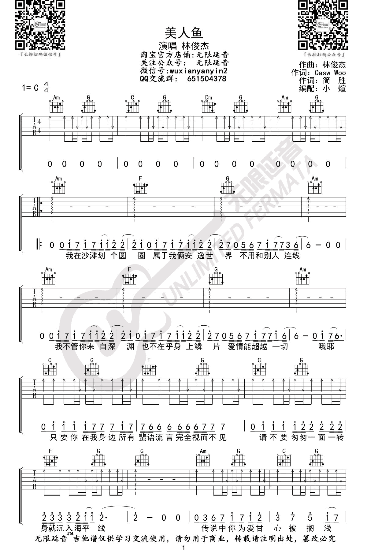 《林俊杰《美人鱼吉他谱》(C调)》内容来自于互联网,不能保证内容的准确性与完整性,仅供学习交流欣赏,请勿用于其它用途,内容版权归原作者及来源网站所有,如有侵犯到您的权益请来信告知,我们将及时删除。