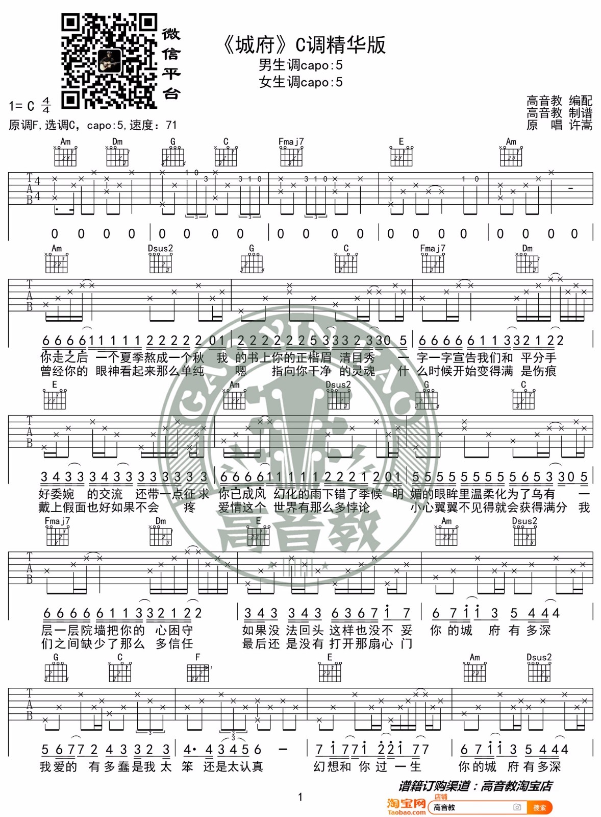 《城府》吉他谱来自许嵩的专辑《自定义》中。歌曲描绘了爱情的心酸和痛苦,歌词中充满了对于爱情真实的探讨:“你的城府有多深,我爱的有多蠢,是我太笨还是太认真,幻想和你过一生”。这份六线谱源自高音教团队,原本调性为F调,但此版本经调整为C调指法原版编排,适合使用变调