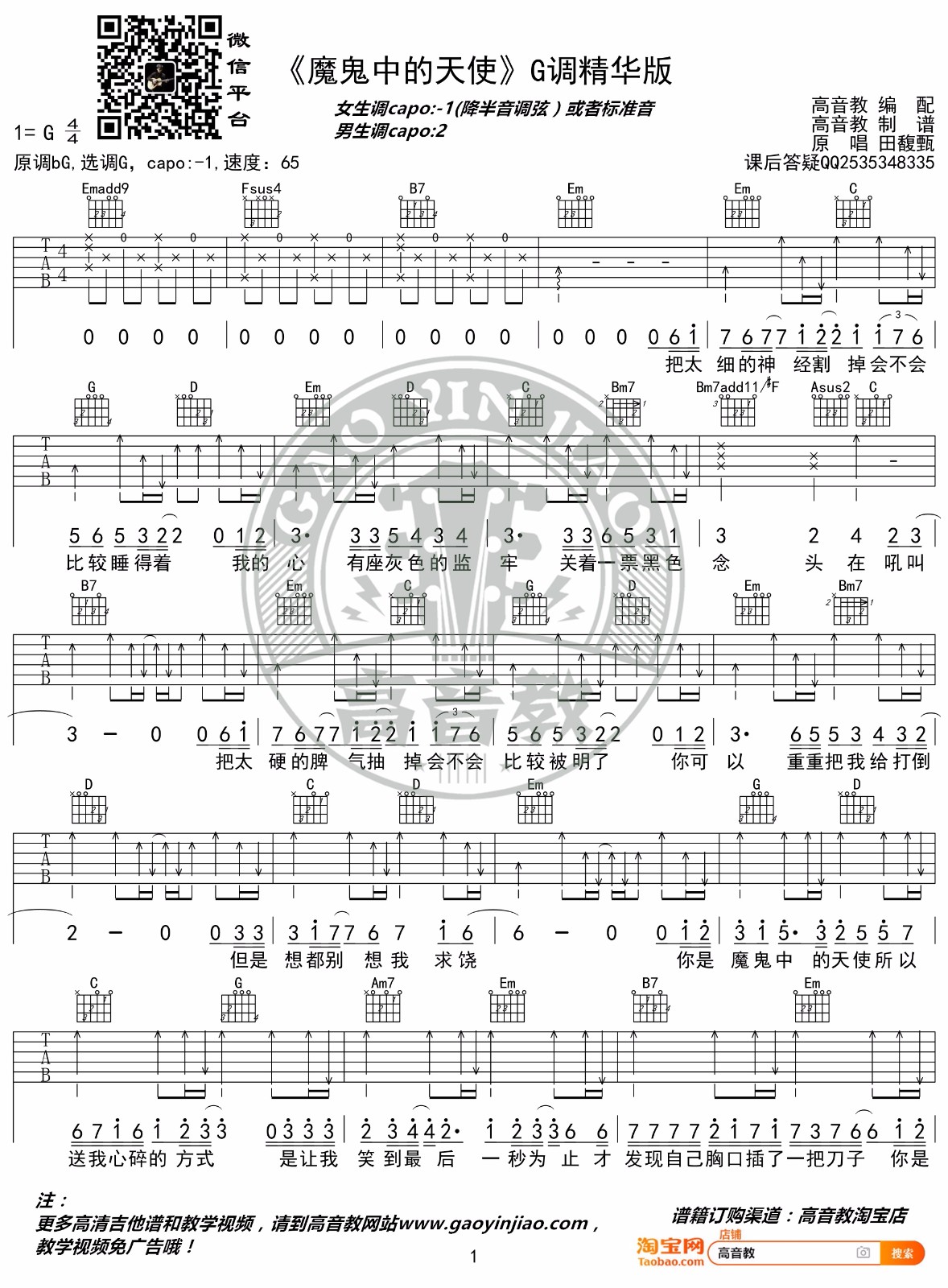 《田馥甄《魔鬼中的天使吉他谱》(G调)》内容来自于互联网,不能保证内容的准确性与完整性,仅供学习交流欣赏,请勿用于其它用途,内容版权归原作者及来源网站所有,如有侵犯到您的权益请来信告知,我们将及时删除。