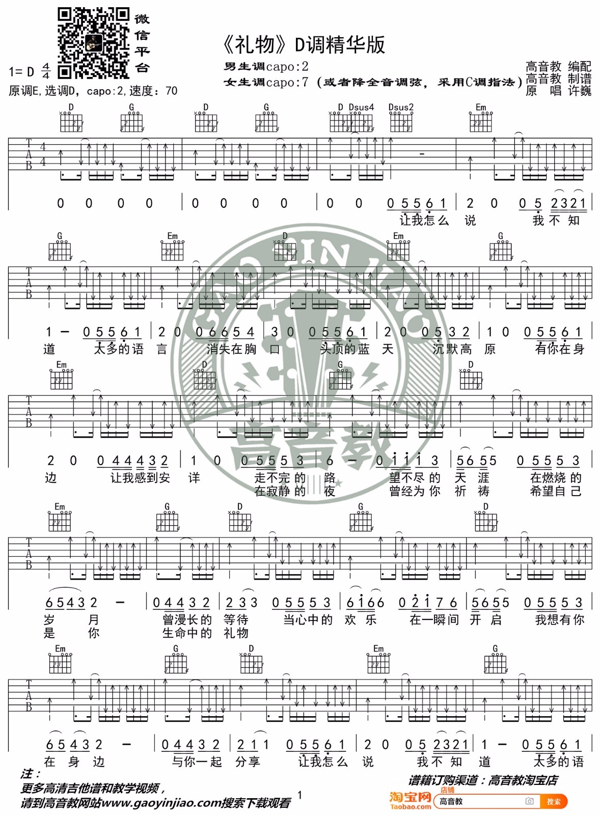 这是一份高清的吉他谱分享,呈现了许巍的心之力作《礼物》。这首歌曲深深触动了许多人,不仅仅是为父母而作,更是送给所有的朋友和亲人,以及那些默默支持我们、在外拼搏的人。曲谱由高音教团队提供,原调为E调,但这里采用了D调指法编排,并使用变调夹夹在2品。这一版本的曲谱
