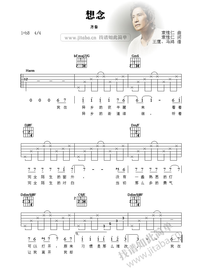 "想念"是一首经典的情歌,由袁惟仁创作,齐秦演唱。这首歌曲充满了难以言喻的情感,深情而忧伤,适合在夜晚聆听。该谱提供了吉他弹唱谱,是吉他爱好者的珍贵收藏。感谢吉他谱网站的琴友们,他们的关注将继续获得更多高质量的曲谱资源分享。