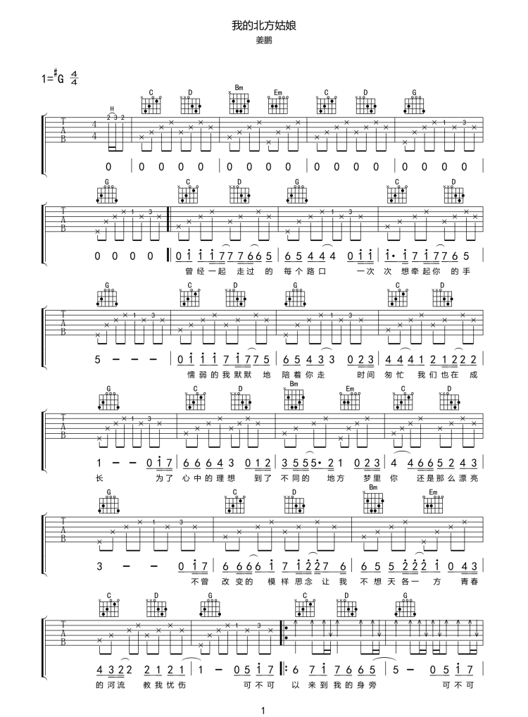 《姜鹏创作并《我的北方姑娘吉他谱》(G调)》内容来自于互联网,不能保证内容的准确性与完整性,仅供学习交流欣赏,请勿用于其它用途,内容版权归原作者及来源网站所有,如有侵犯到您的权益请来信告知,我们将及时删除。