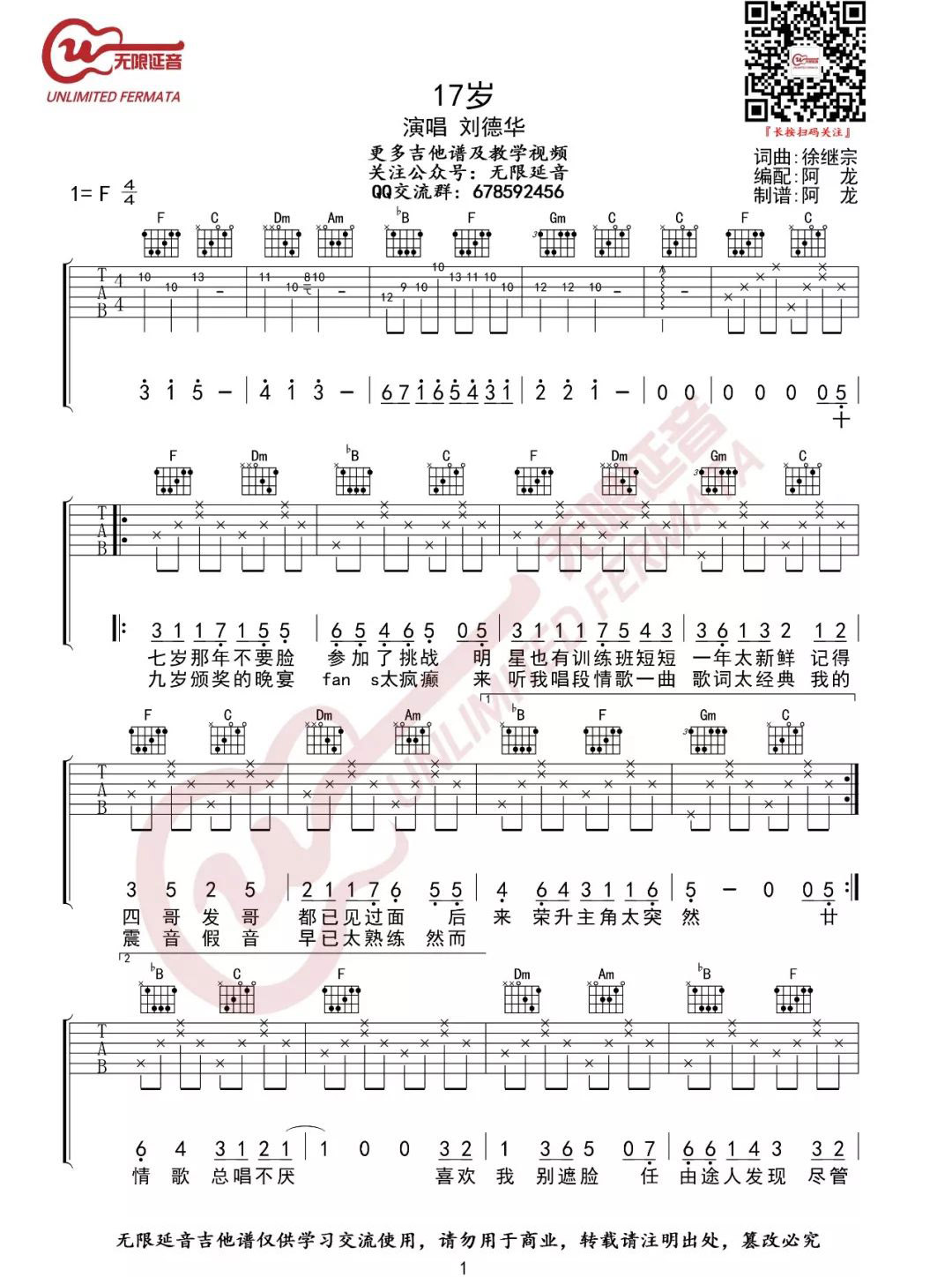 《刘德华《17岁吉他谱》(F调)》内容来自于互联网,不能保证内容的准确性与完整性,仅供学习交流欣赏,请勿用于其它用途,内容版权归原作者及来源网站所有,如有侵犯到您的权益请来信告知,我们将及时删除。