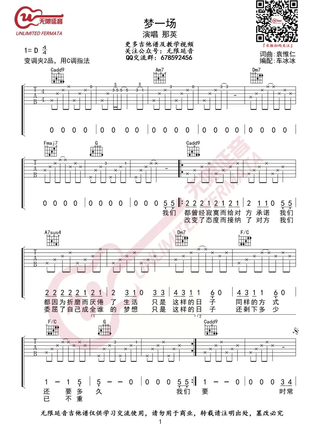 《梁咏琪《梦一场吉他谱》(C调)》内容来自于互联网,不能保证内容的准确性与完整性,仅供学习交流欣赏,请勿用于其它用途,内容版权归原作者及来源网站所有,如有侵犯到您的权益请来信告知,我们将及时删除。