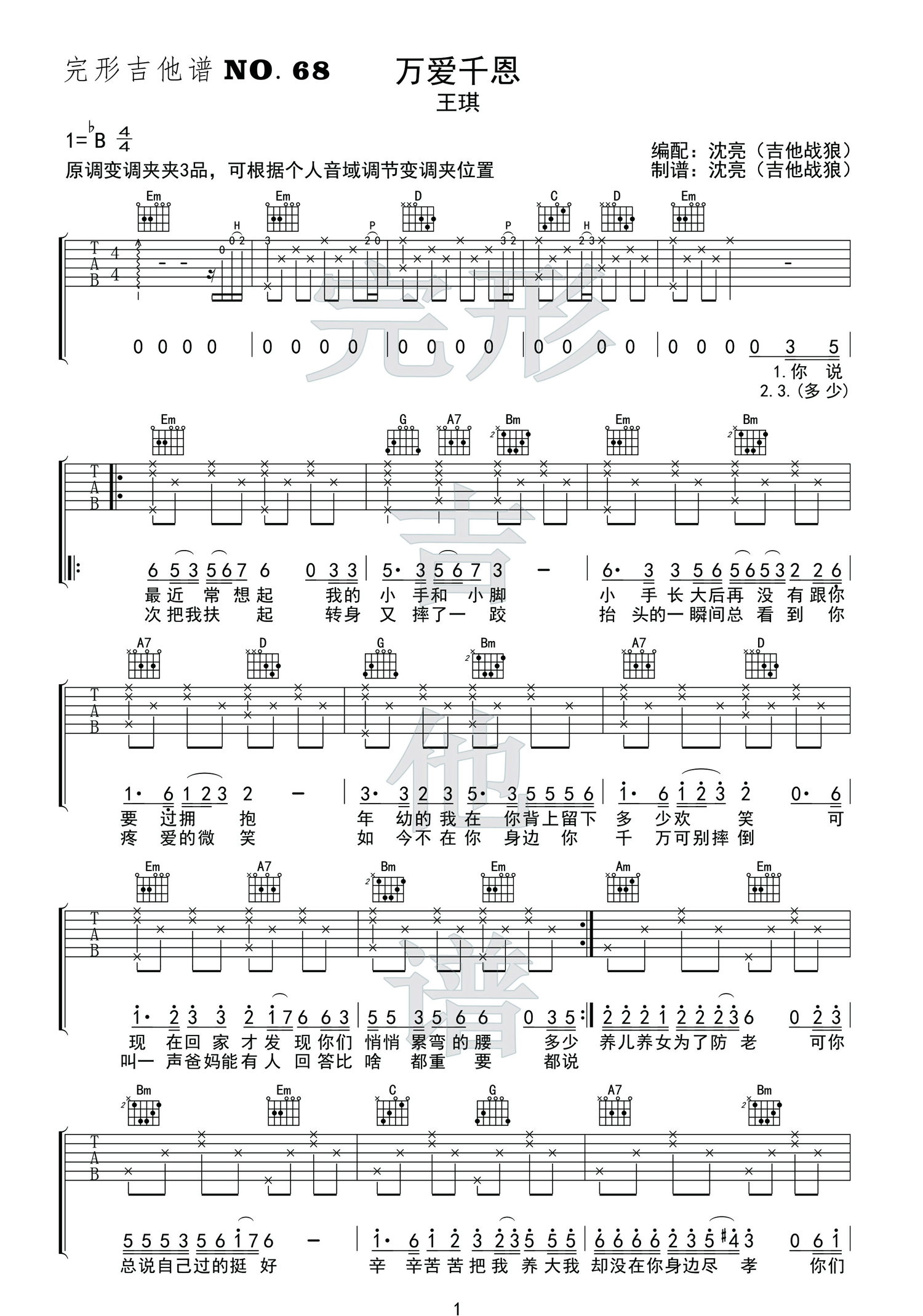 王琪创作并演唱的《万爱千恩》是一首表达对父母深切感激之情的歌曲。曲谱以G调原版弹唱六线谱为基础,完形吉他扒谱制作,使歌曲更适合演奏。歌词温馨感人,呼唤父母健康长寿,关切父母的欢笑和安危,期盼能有更多时间陪伴和孝敬父母。曲谱以G调指法编配,演唱时需使用变调夹3品