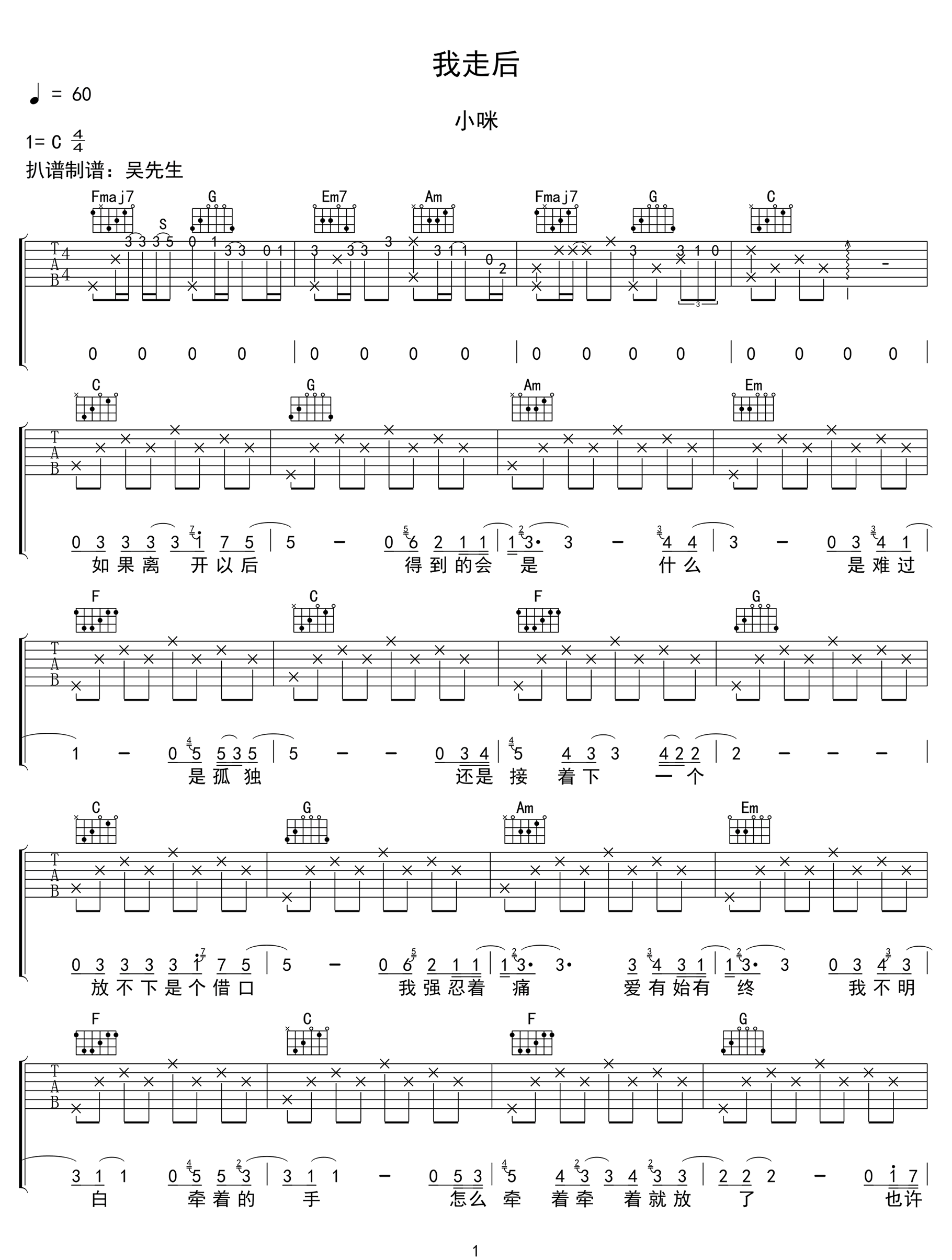 《小咪《我走后吉他谱》(C调)》内容来自于互联网,不能保证内容的准确性与完整性,仅供学习交流欣赏,请勿用于其它用途,内容版权归原作者及来源网站所有,如有侵犯到您的权益请来信告知,我们将及时删除。
