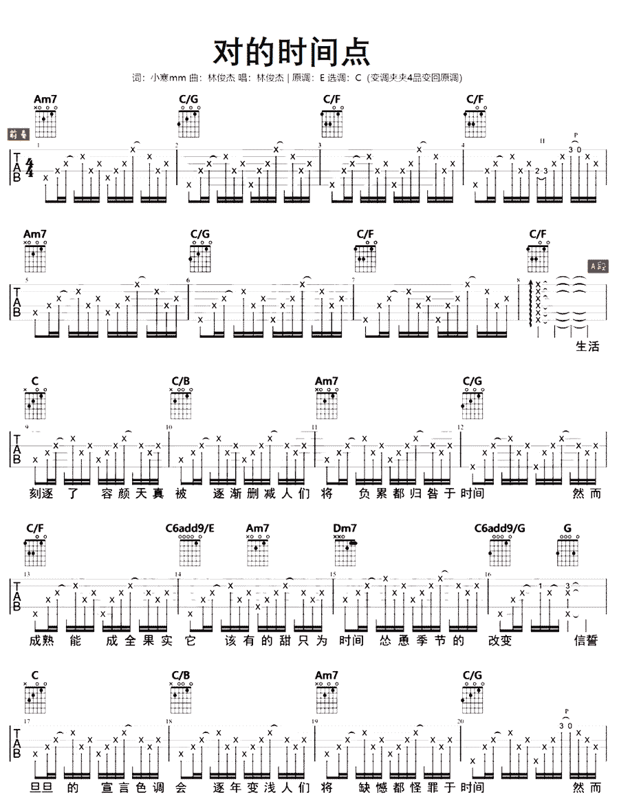 《林俊杰《对的时间点吉他谱》(C调)》内容来自于互联网,不能保证内容的准确性与完整性,仅供学习交流欣赏,请勿用于其它用途,内容版权归原作者及来源网站所有,如有侵犯到您的权益请来信告知,我们将及时删除。