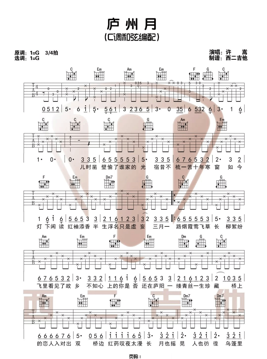 《西二《庐州月吉他谱》(G调)》内容来自于互联网,不能保证内容的准确性与完整性,仅供学习交流欣赏,请勿用于其它用途,内容版权归原作者及来源网站所有,如有侵犯到您的权益请来信告知,我们将及时删除。