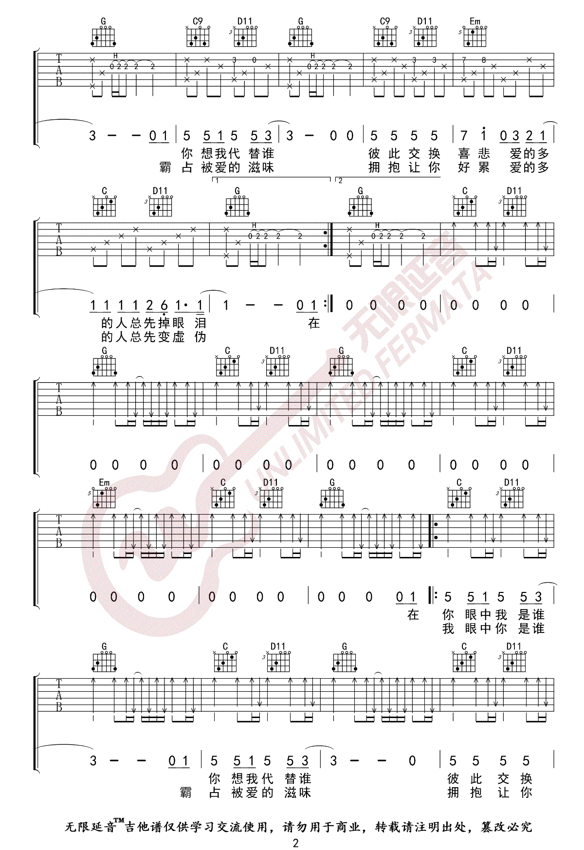 《廖俊涛《谁吉他谱》(G调)》内容来自于互联网,不能保证内容的准确性与完整性,仅供学习交流欣赏,请勿用于其它用途,内容版权归原作者及来源网站所有,如有侵犯到您的权益请来信告知,我们将及时删除。