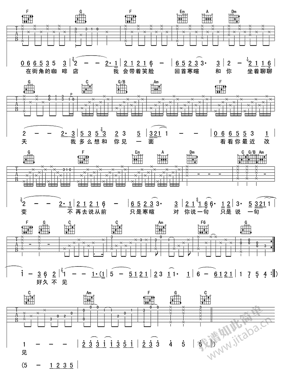 《陈奕迅《好久不见吉他谱》(C调)》内容来自于互联网,不能保证内容的准确性与完整性,仅供学习交流欣赏,请勿用于其它用途,内容版权归原作者及来源网站所有,如有侵犯到您的权益请来信告知,我们将及时删除。