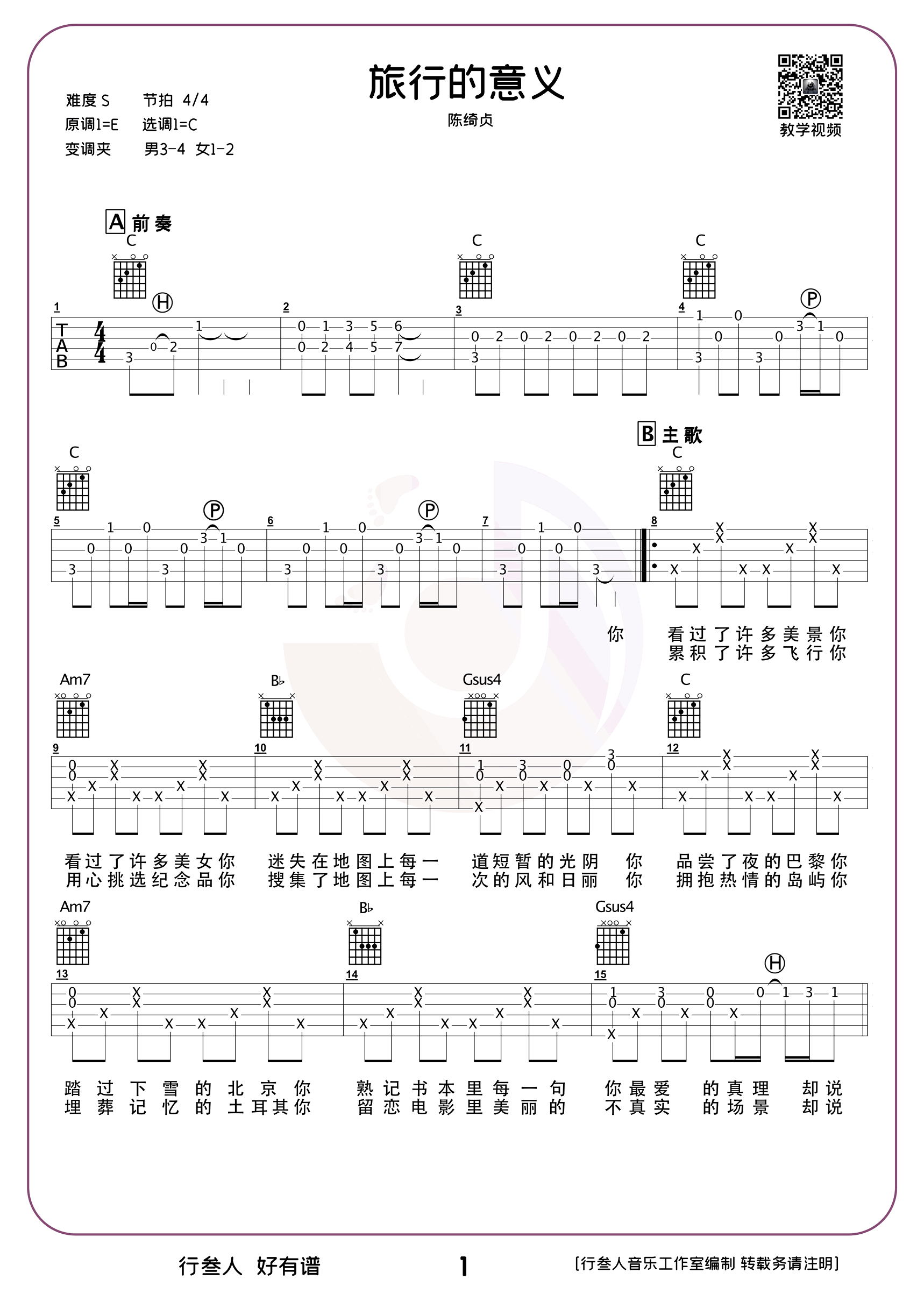 陈绮贞的《旅行的意义》是一首清新的民谣歌曲,吉他谱以C调编配,相比原版D调难度降低,大幅减少大横按,更适合男女生演唱。虽然难度S级,但适合个人弹唱挑战,需要连贯演奏旋律音。重点在间奏部分,要注意突出低音进行,尤其在“低音下行”处右手大拇指需用力。这首歌探讨旅行