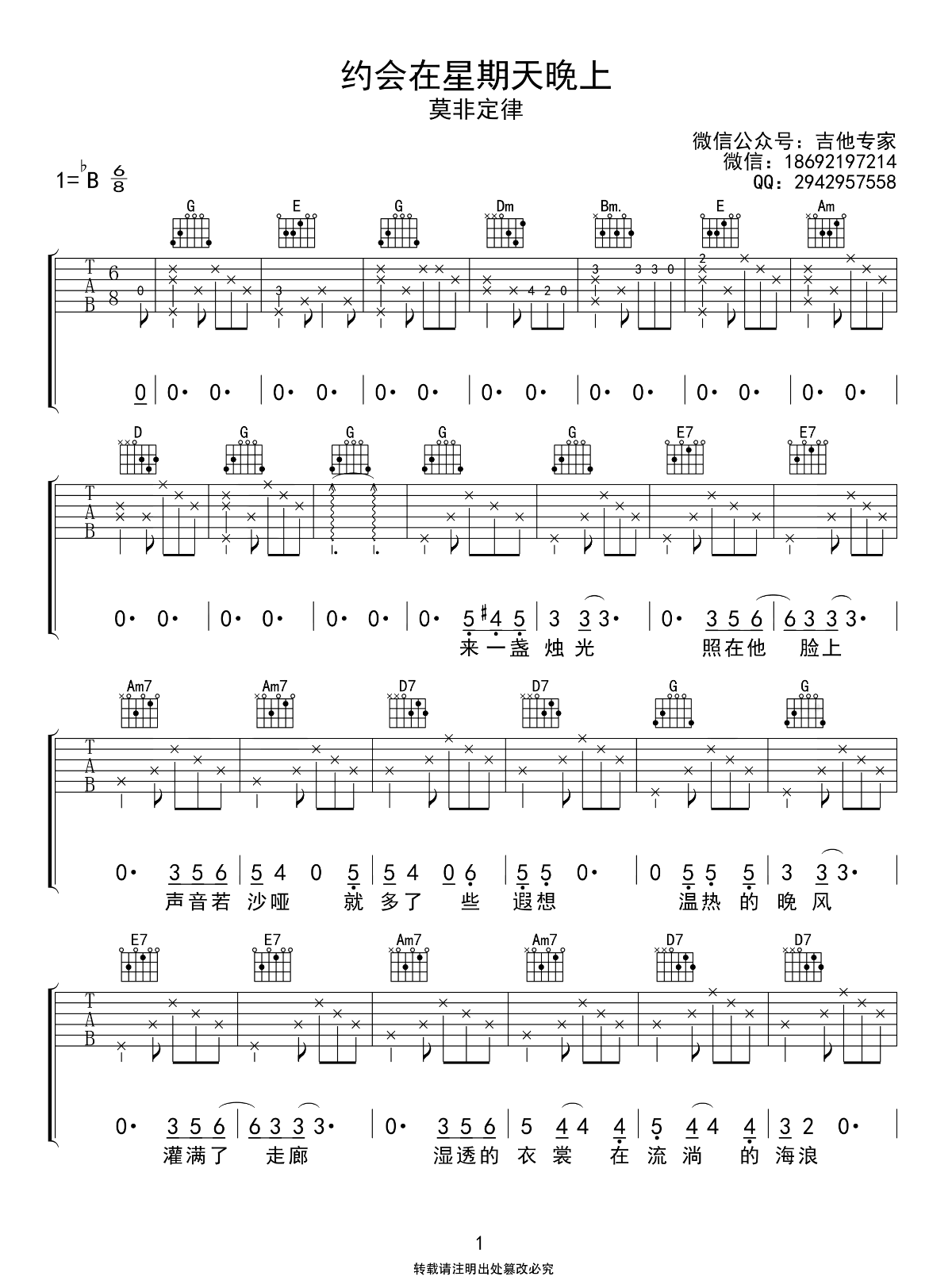 《《约会在星期天晚上吉他谱》》内容来自于互联网,不能保证内容的准确性与完整性,仅供学习交流欣赏,请勿用于其它用途,内容版权归原作者及来源网站所有,如有侵犯到您的权益请来信告知,我们将及时删除。