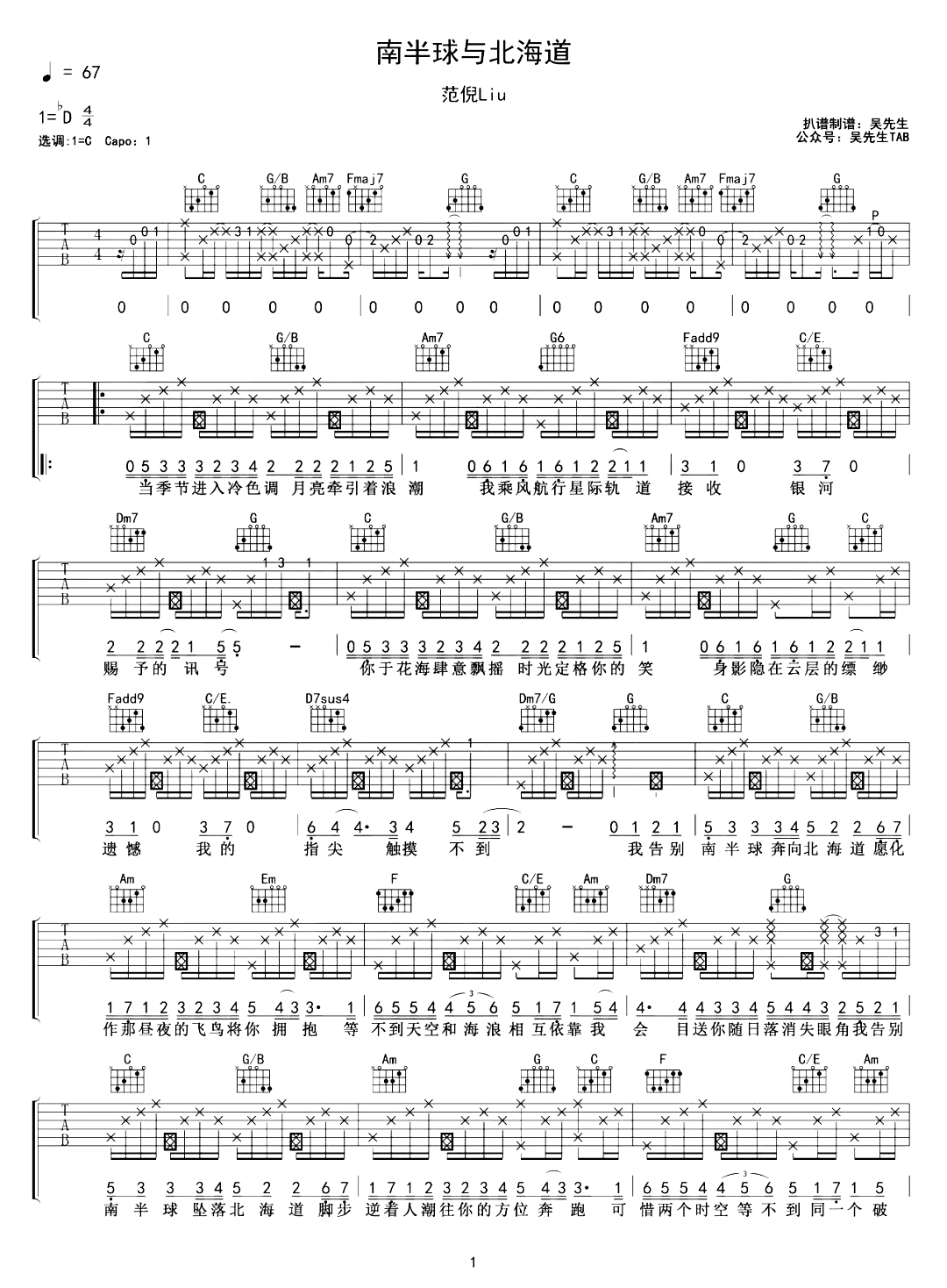 《范倪Liu《南半球与北海道吉他谱》(C调)》内容来自于互联网,不能保证内容的准确性与完整性,仅供学习交流欣赏,请勿用于其它用途,内容版权归原作者及来源网站所有,如有侵犯到您的权益请来信告知,我们将及时删除。