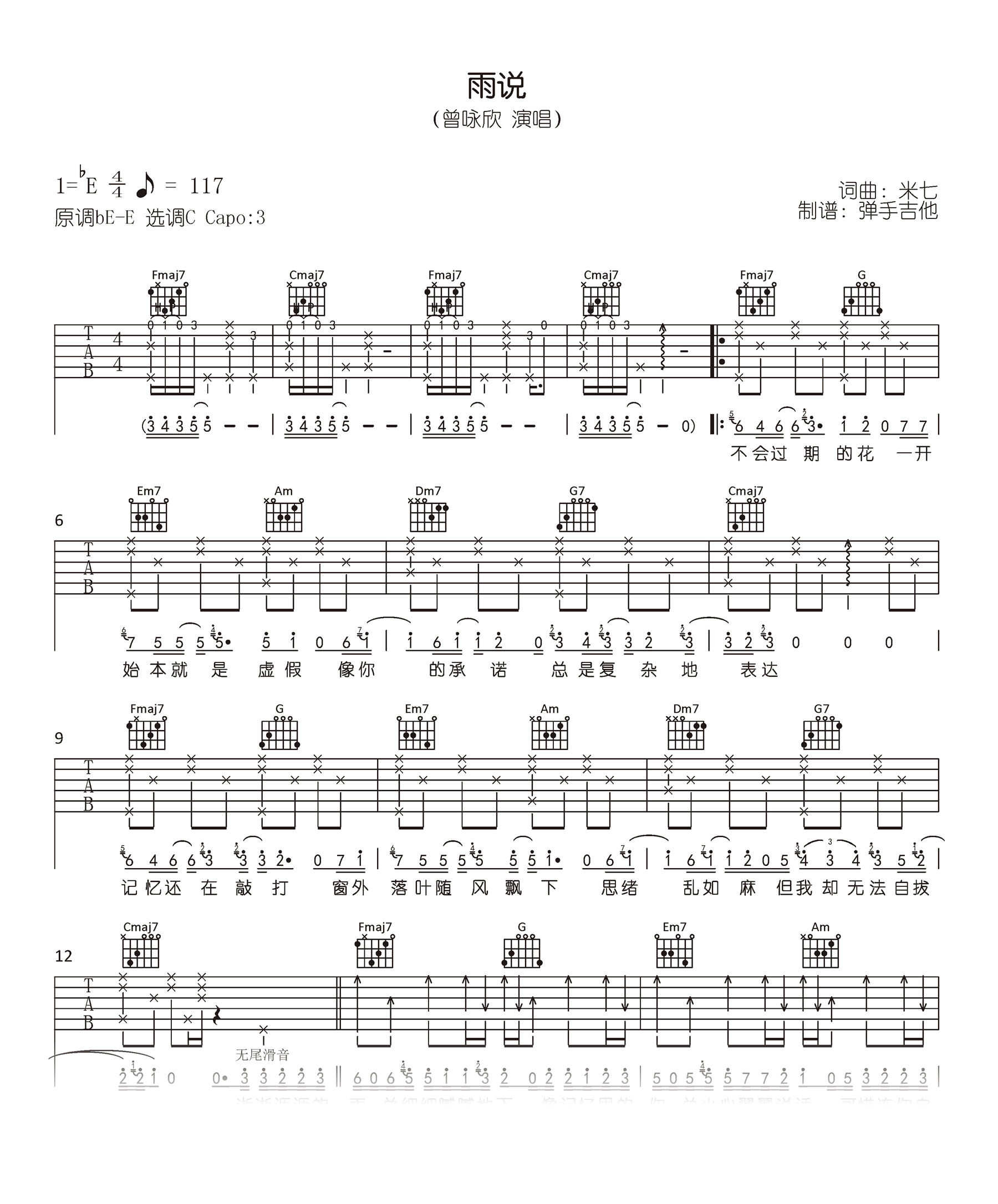 《《雨说吉他谱》(C调)》内容来自于互联网,不能保证内容的准确性与完整性,仅供学习交流欣赏,请勿用于其它用途,内容版权归原作者及来源网站所有,如有侵犯到您的权益请来信告知,我们将及时删除。