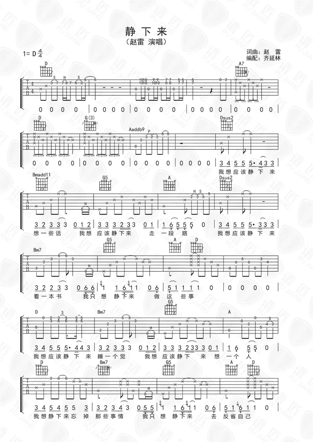 《赵雷《静下来吉他谱》(D调)》内容来自于互联网,不能保证内容的准确性与完整性,仅供学习交流欣赏,请勿用于其它用途,内容版权归原作者及来源网站所有,如有侵犯到您的权益请来信告知,我们将及时删除。