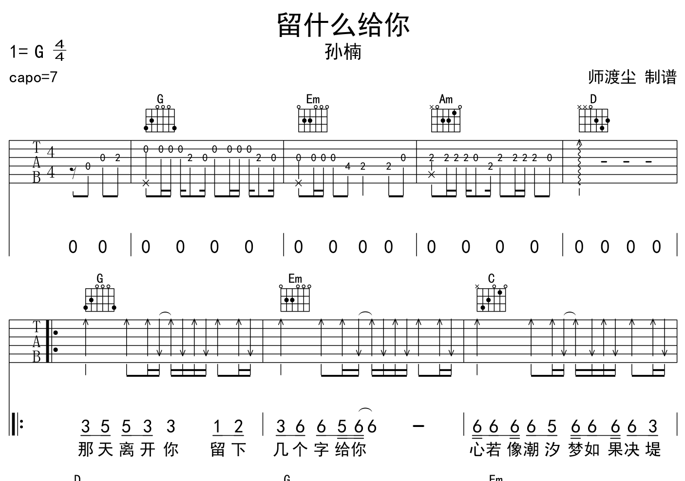 《孙楠《留什么给你吉他谱》(G调)》内容来自于互联网,不能保证内容的准确性与完整性,仅供学习交流欣赏,请勿用于其它用途,内容版权归原作者及来源网站所有,如有侵犯到您的权益请来信告知,我们将及时删除。