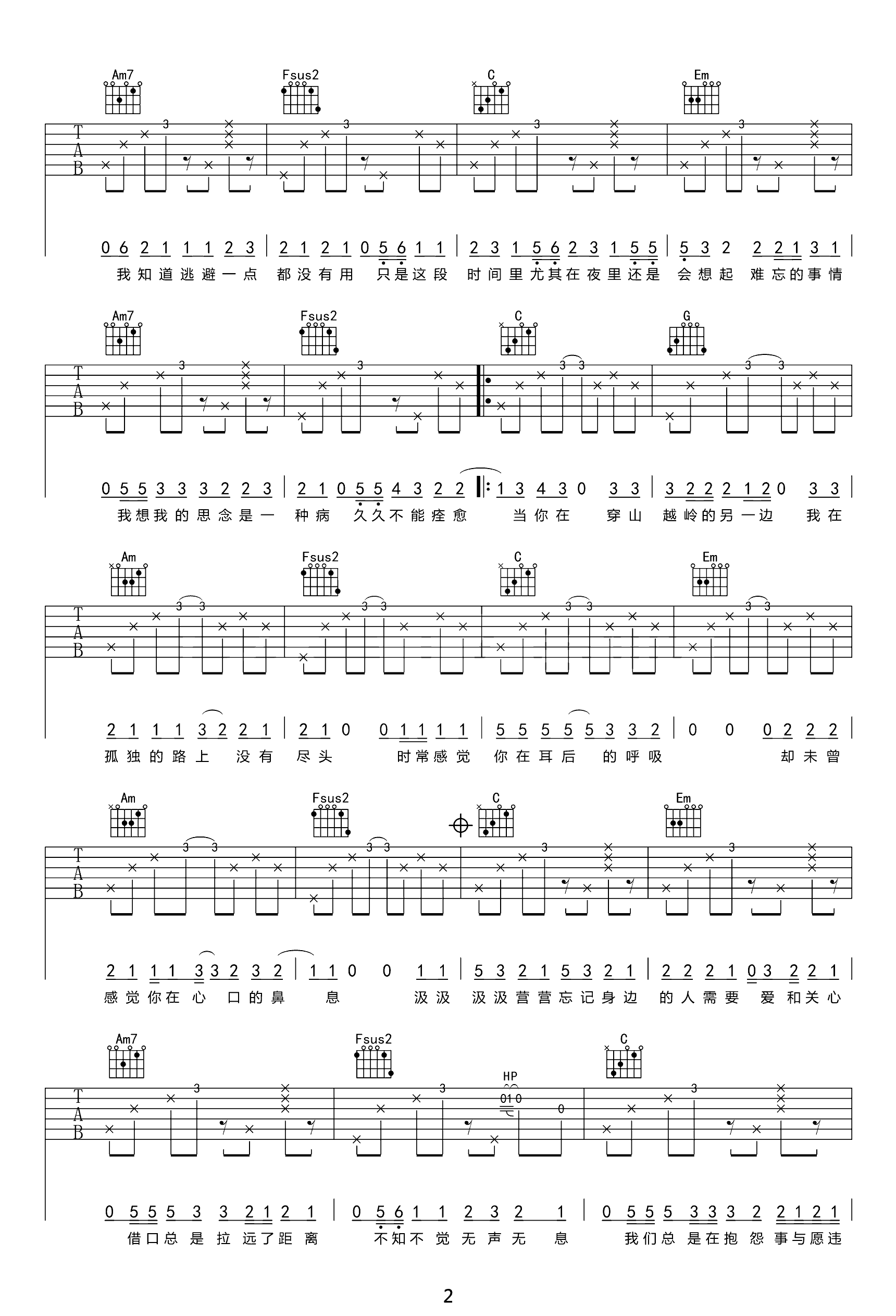 张震岳的经典歌曲改编自齐秦的作品,名为《思念是一种病》。吉他谱以D调改编为C调,Capo夹置于二品。这份吉他弹唱谱包含完整高清的六线谱,共有四张图片示例。