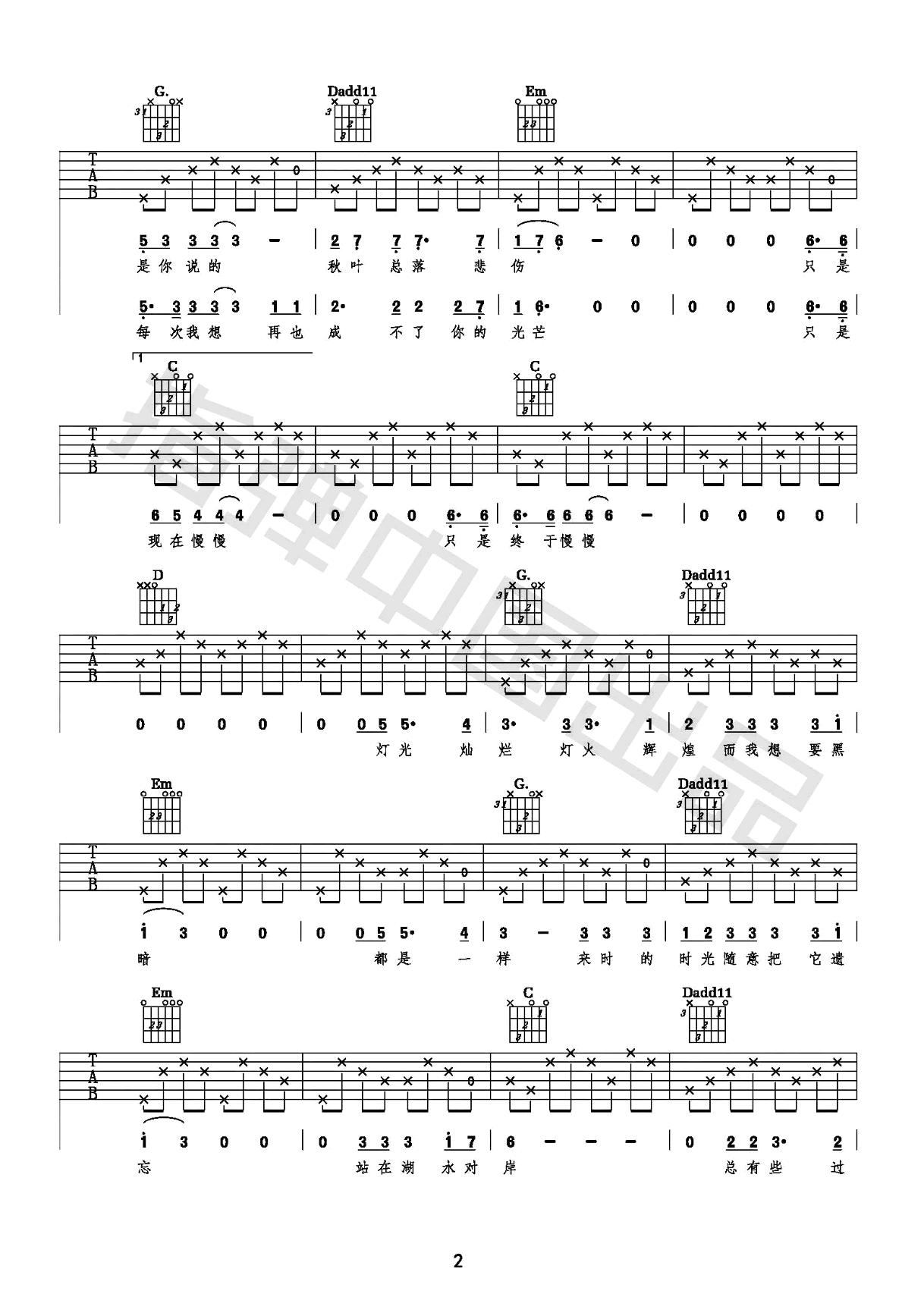 这是一首由麻园诗人演唱的民谣歌曲,以泸沽湖为灵感创作,吉他谱采用原调B和选调G,使用CAPO夹四品,总共有五张图片,呈现出清新的六线谱。附带配套弹唱教学视频,由王一老师亲自演示。歌曲运用了丰富多彩的和弦,给人一种非常动听的感觉。如果你喜欢麻园诗人的音乐,千万不