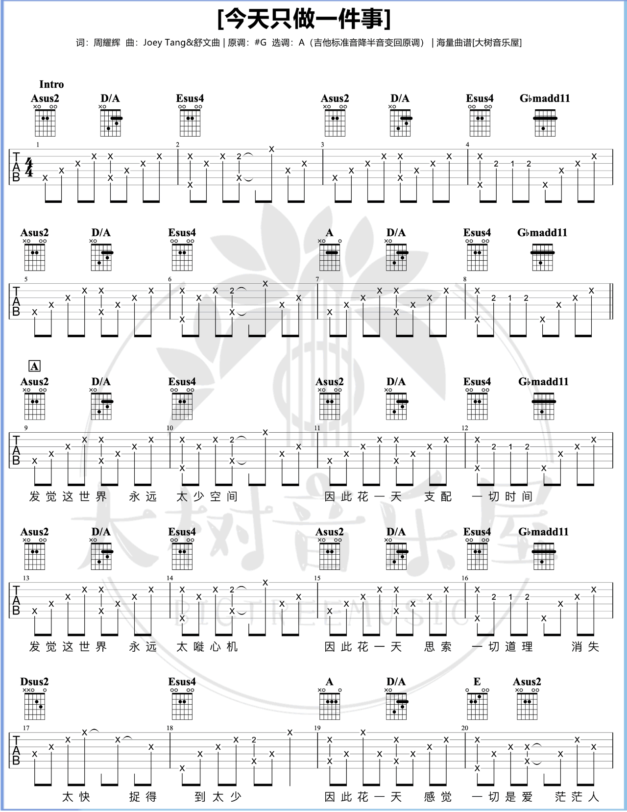 《陈奕迅《今天只做一件事吉他谱》》内容来自于互联网,不能保证内容的准确性与完整性,仅供学习交流欣赏,请勿用于其它用途,内容版权归原作者及来源网站所有,如有侵犯到您的权益请来信告知,我们将及时删除。