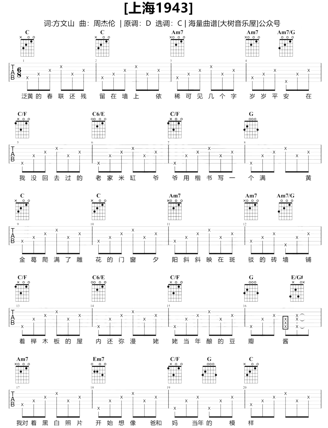 《周杰伦《上海1943吉他谱》(C调)》内容来自于互联网,不能保证内容的准确性与完整性,仅供学习交流欣赏,请勿用于其它用途,内容版权归原作者及来源网站所有,如有侵犯到您的权益请来信告知,我们将及时删除。
