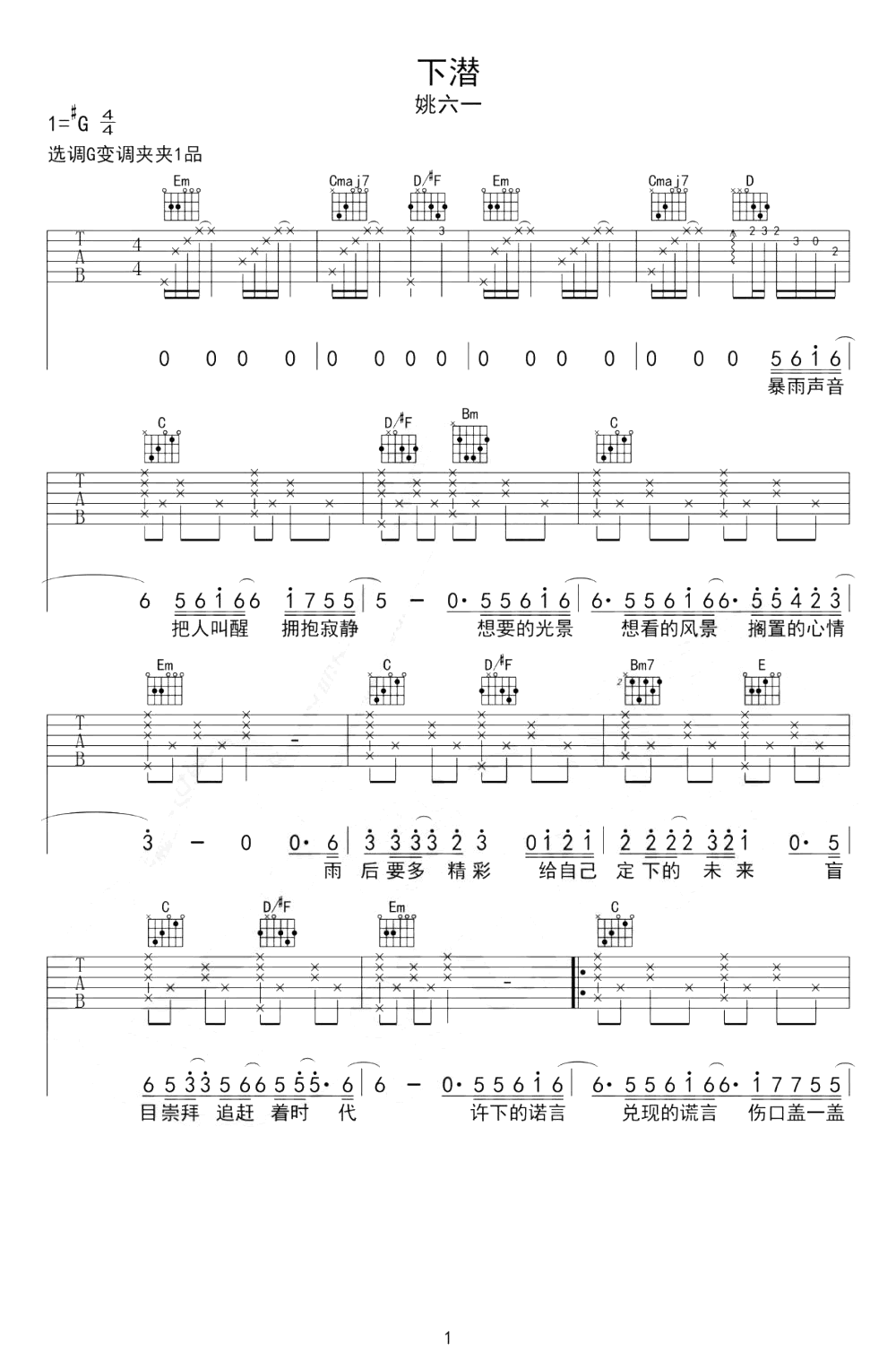 《姚六一《下潜吉他谱》(G调)》内容来自于互联网,不能保证内容的准确性与完整性,仅供学习交流欣赏,请勿用于其它用途,内容版权归原作者及来源网站所有,如有侵犯到您的权益请来信告知,我们将及时删除。