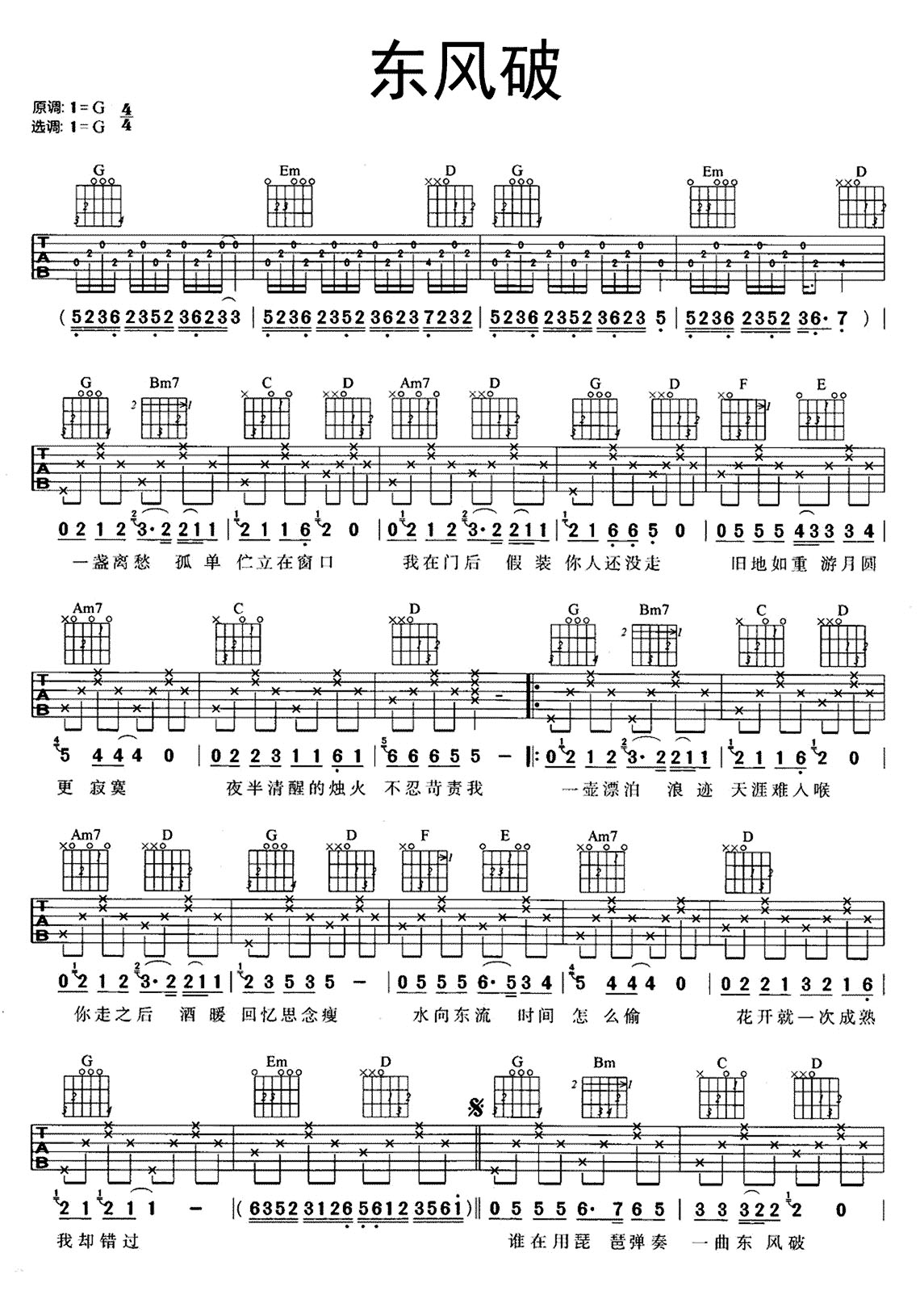 《周杰伦《东风破(吉他谱》(G调)》内容来自于互联网,不能保证内容的准确性与完整性,仅供学习交流欣赏,请勿用于其它用途,内容版权归原作者及来源网站所有,如有侵犯到您的权益请来信告知,我们将及时删除。
