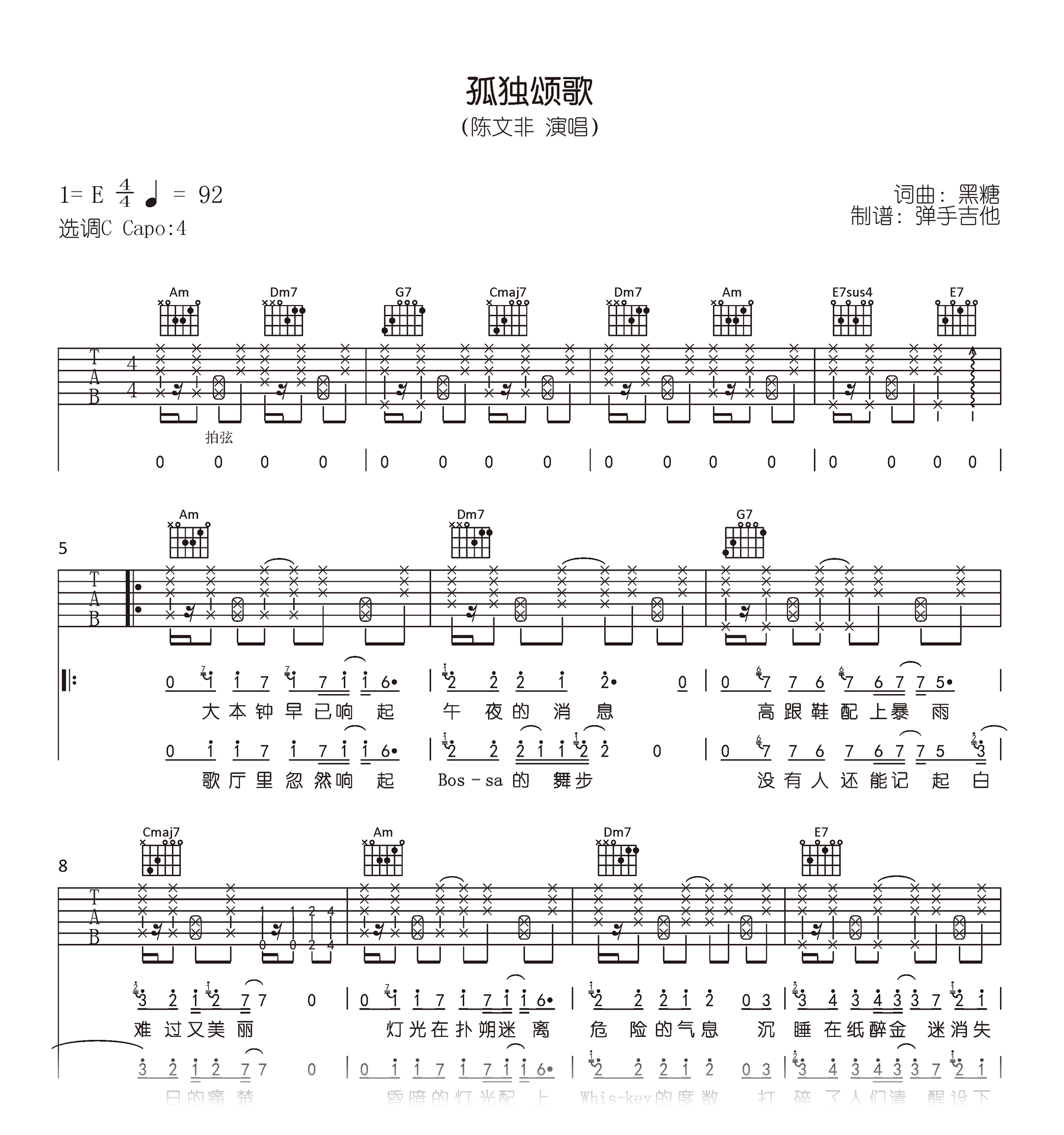 这首名为《孤独颂歌》的吉他弹唱曲目以E调谱写,但选用C调进行演奏,并使用CAPO夹固定在第四品。提供了三张高清图片谱,展示了这首曲目的谱表。