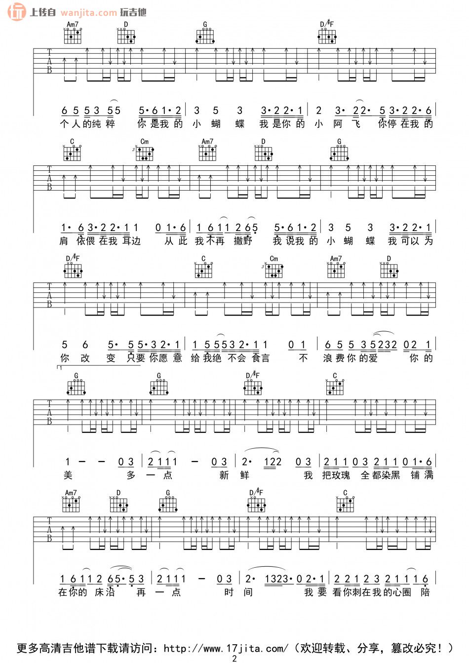 《阿飞的小蝴蝶》吉他谱原调G调,齐元义编配,无需变调夹。整体曲谱不算复杂,注重情感表达,特别适合吉他演奏,成为一首深情的爱情流行曲。