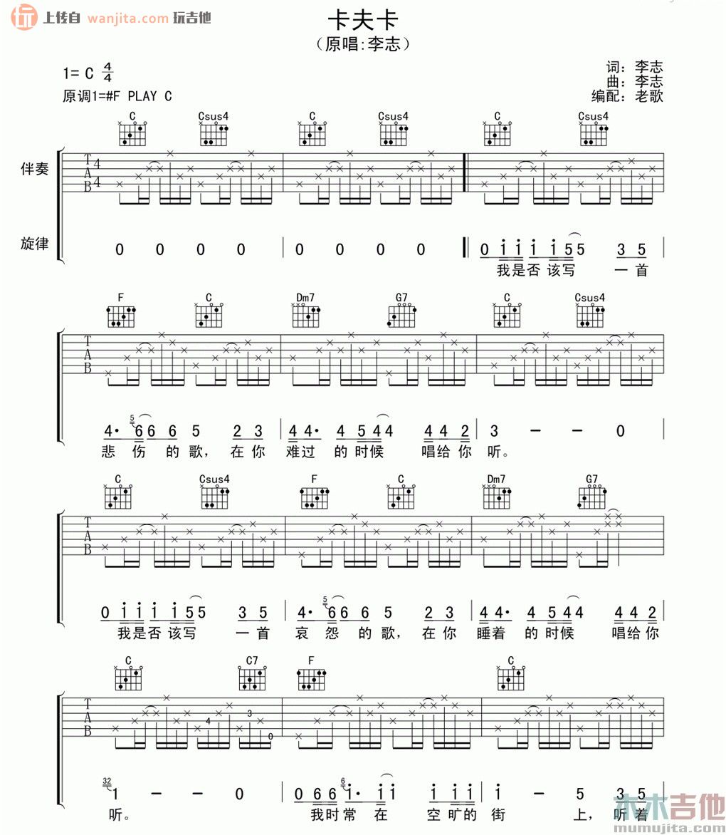 李志的《卡夫卡》吉他谱以升F调为原调,采用C调指法,分为3张高清图片谱。曲子的节拍为4/4拍,无需使用变调夹,适合初学者弹唱,难度不高。