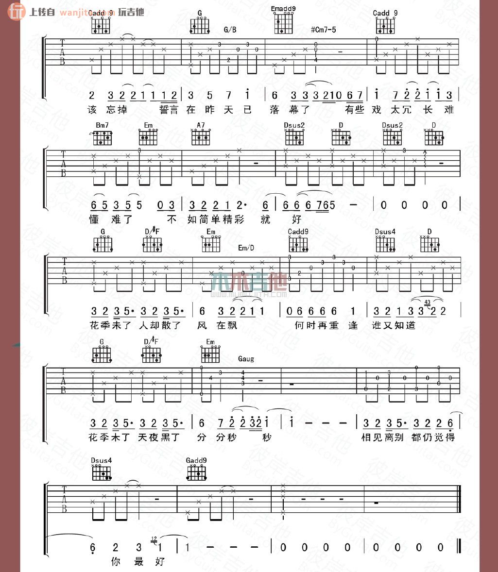 《张信哲《花季未了吉他谱》(F调)》内容来自于互联网,不能保证内容的准确性与完整性,仅供学习交流欣赏,请勿用于其它用途,内容版权归原作者及来源网站所有,如有侵犯到您的权益请来信告知,我们将及时删除。