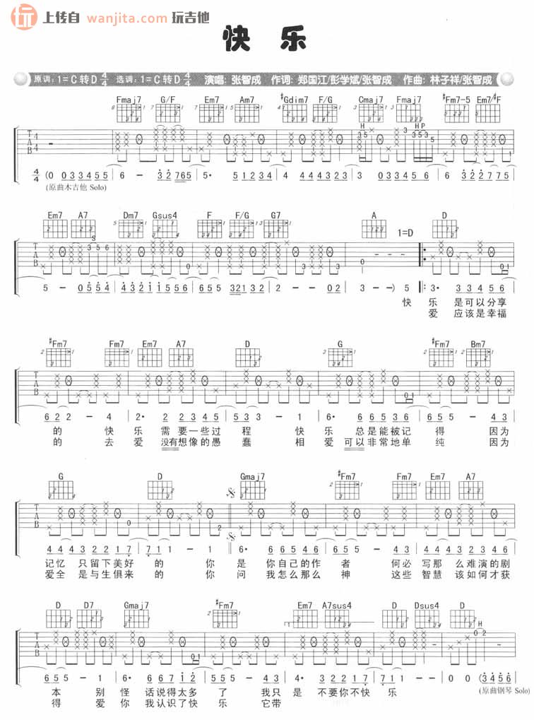 张智成演绎的《快乐》吉他谱包含2张高清图片,原调C调已转为D调,4/4拍节奏,建议初学者不使用变调夹,弹唱难度适中。