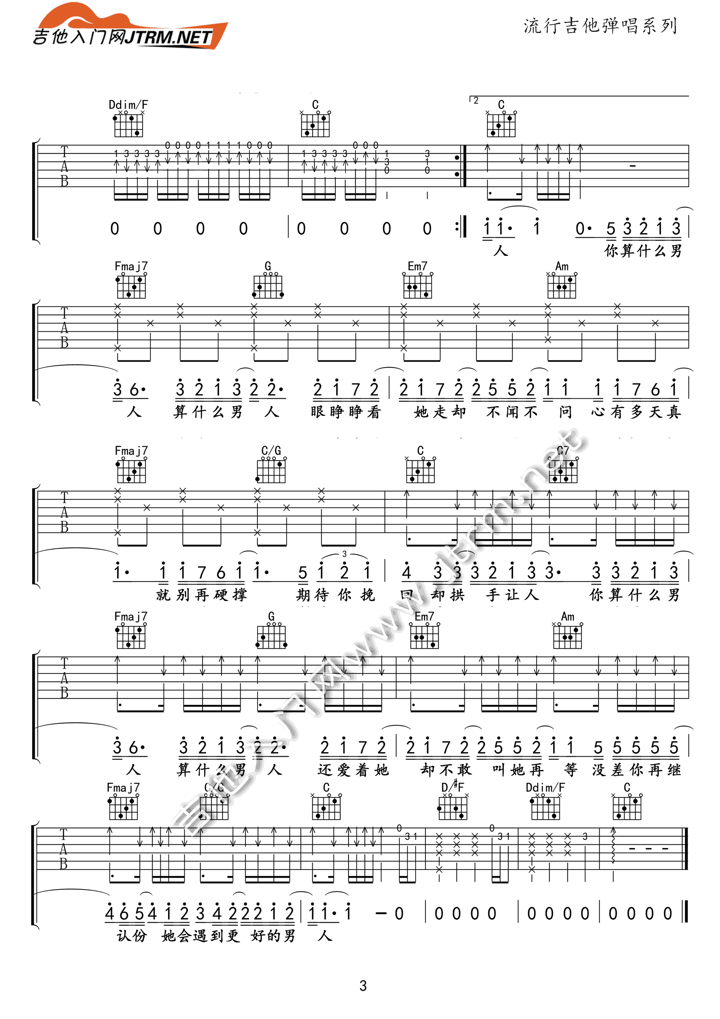 《周杰伦《算什么男人吉他谱》(C调)》内容来自于互联网,不能保证内容的准确性与完整性,仅供学习交流欣赏,请勿用于其它用途,内容版权归原作者及来源网站所有,如有侵犯到您的权益请来信告知,我们将及时删除。