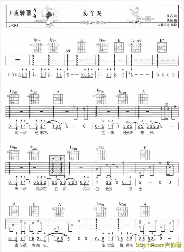 《张学友《忘了哭吉他谱》(B调)》内容来自于互联网,不能保证内容的准确性与完整性,仅供学习交流欣赏,请勿用于其它用途,内容版权归原作者及来源网站所有,如有侵犯到您的权益请来信告知,我们将及时删除。