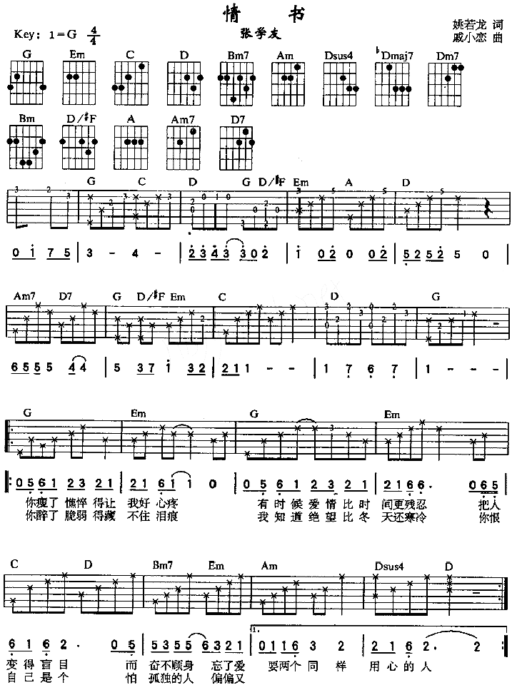 《张学友《情书吉他谱》(G调)》内容来自于互联网,不能保证内容的准确性与完整性,仅供学习交流欣赏,请勿用于其它用途,内容版权归原作者及来源网站所有,如有侵犯到您的权益请来信告知,我们将及时删除。