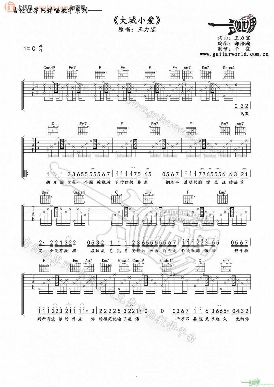 《王力宏《大城小爱吉他谱》(C调)》内容来自于互联网,不能保证内容的准确性与完整性,仅供学习交流欣赏,请勿用于其它用途,内容版权归原作者及来源网站所有,如有侵犯到您的权益请来信告知,我们将及时删除。
