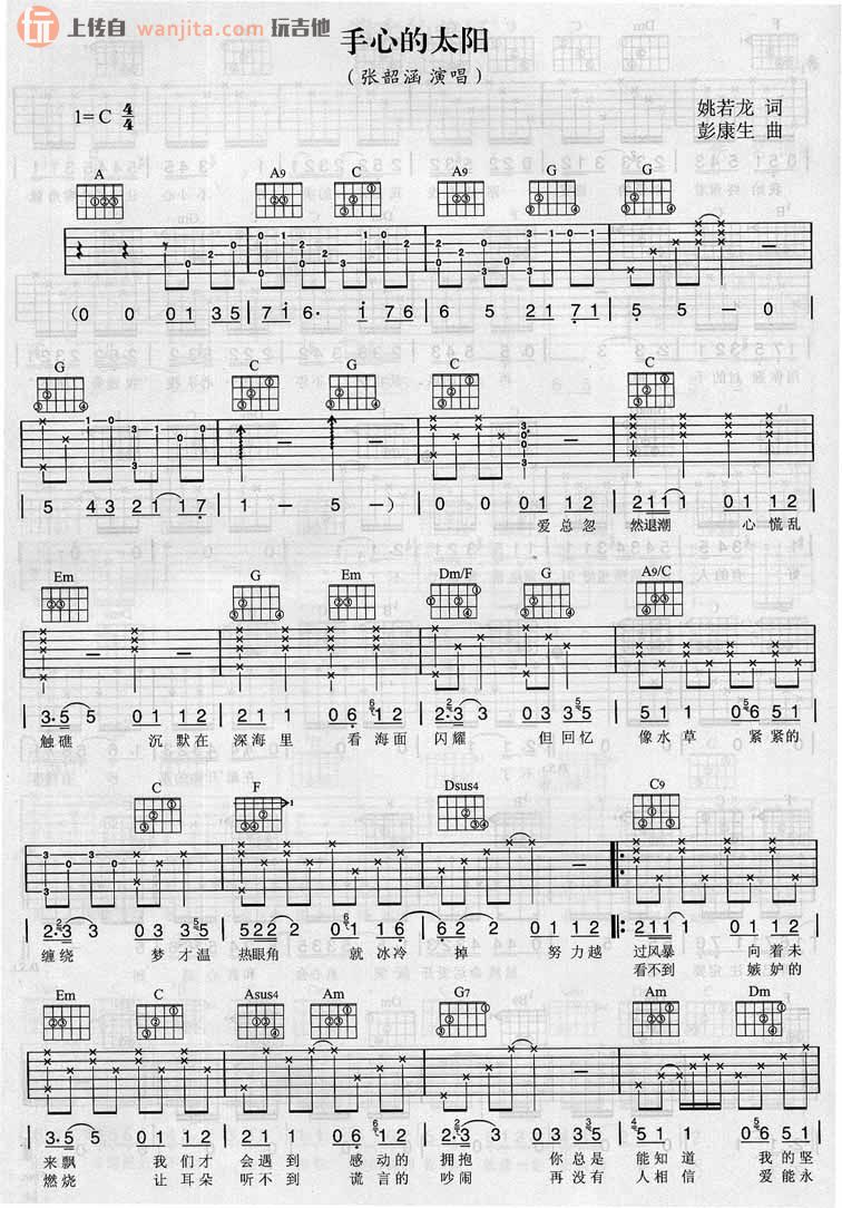 《张韶涵《手心的太阳吉他谱》》内容来自于互联网,不能保证内容的准确性与完整性,仅供学习交流欣赏,请勿用于其它用途,内容版权归原作者及来源网站所有,如有侵犯到您的权益请来信告知,我们将及时删除。