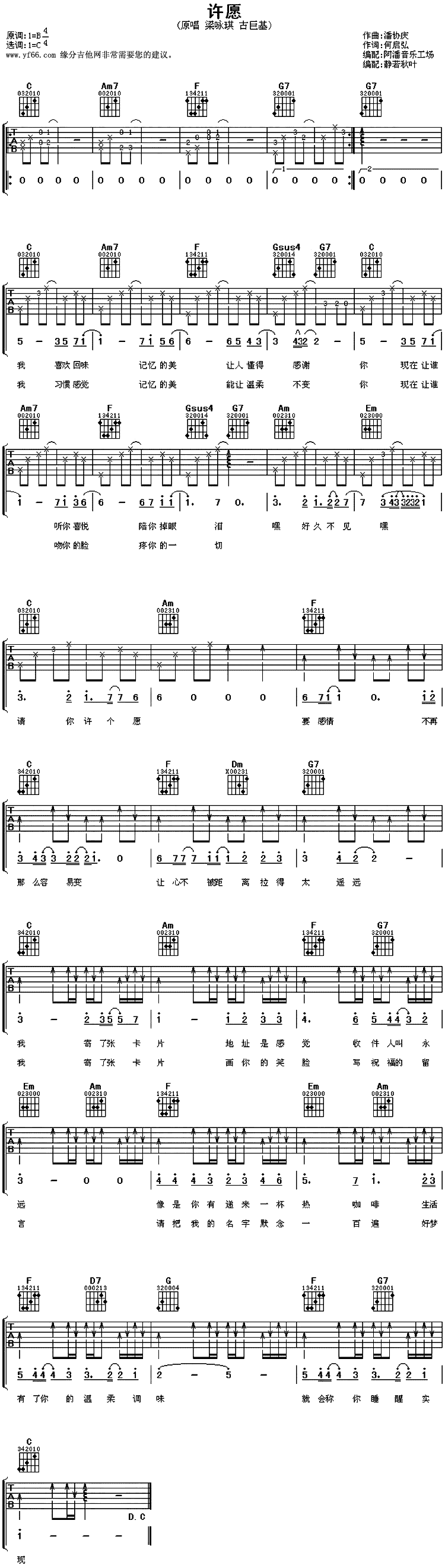 《古巨基《许愿吉他谱》(C调)》内容来自于互联网,不能保证内容的准确性与完整性,仅供学习交流欣赏,请勿用于其它用途,内容版权归原作者及来源网站所有,如有侵犯到您的权益请来信告知,我们将及时删除。
