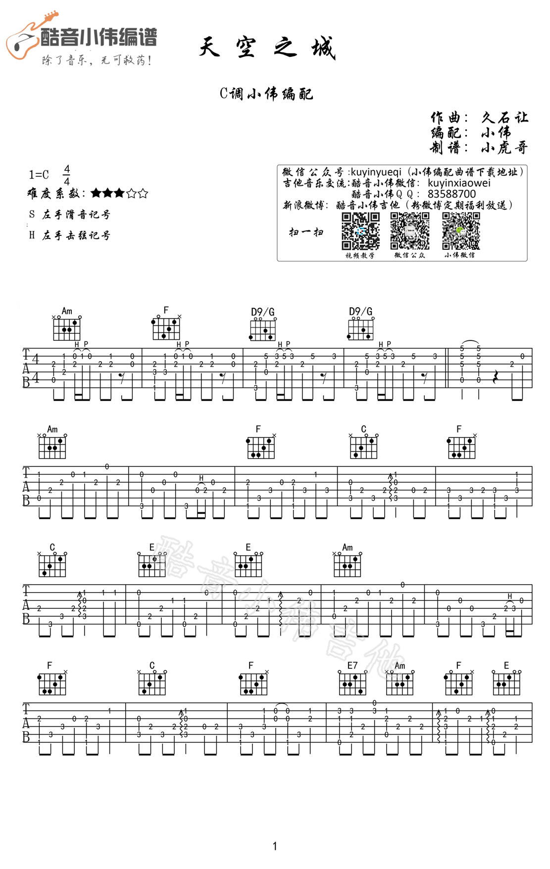久石让的经典之作《天空之城》吉他谱以清澈动人的旋律,勾勒出令人陶醉的天空之城。这首C调指弹谱巧妙地将纯真和幻想融入音符间,跨越了语言和文化的障碍,成为人们共同的音乐记忆。谱中充满了童话般的美丽,仿佛漫步在无边幻想之境。感谢酷音小伟的精心编配,这份六线谱图片格式