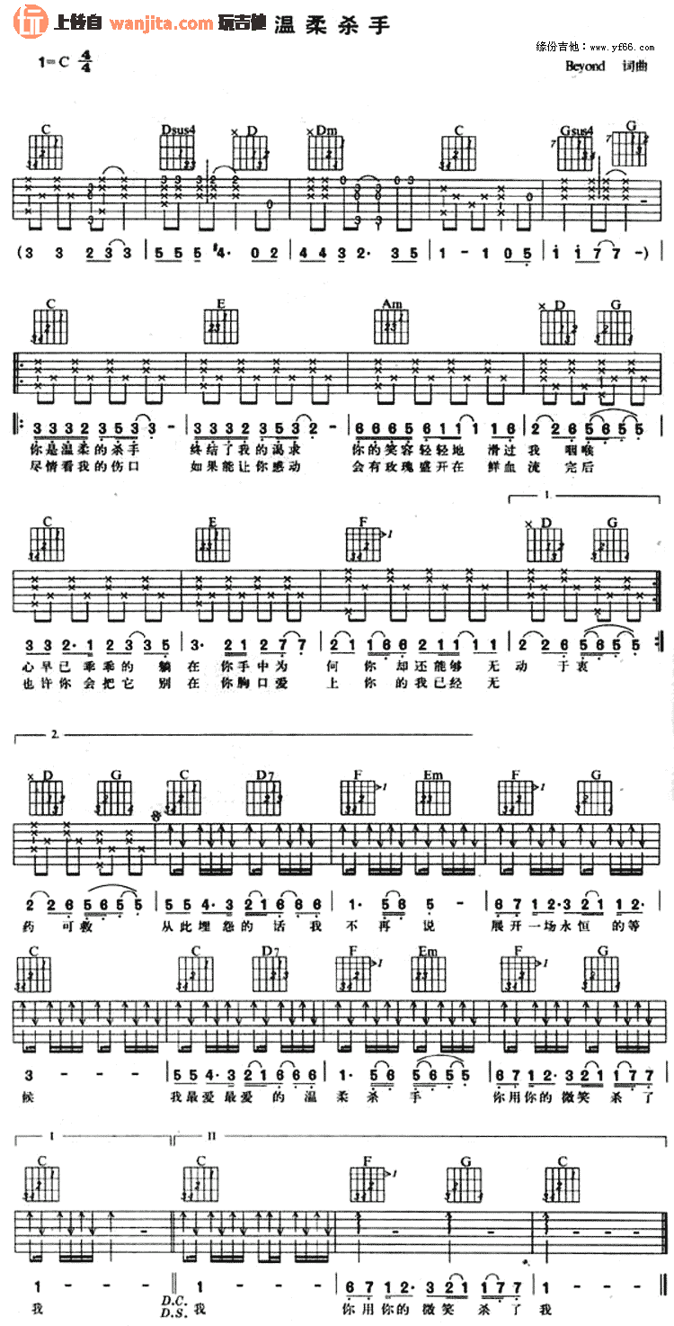 《Beyond《温柔杀手吉他谱》(C调)》内容来自于互联网,不能保证内容的准确性与完整性,仅供学习交流欣赏,请勿用于其它用途,内容版权归原作者及来源网站所有,如有侵犯到您的权益请来信告知,我们将及时删除。