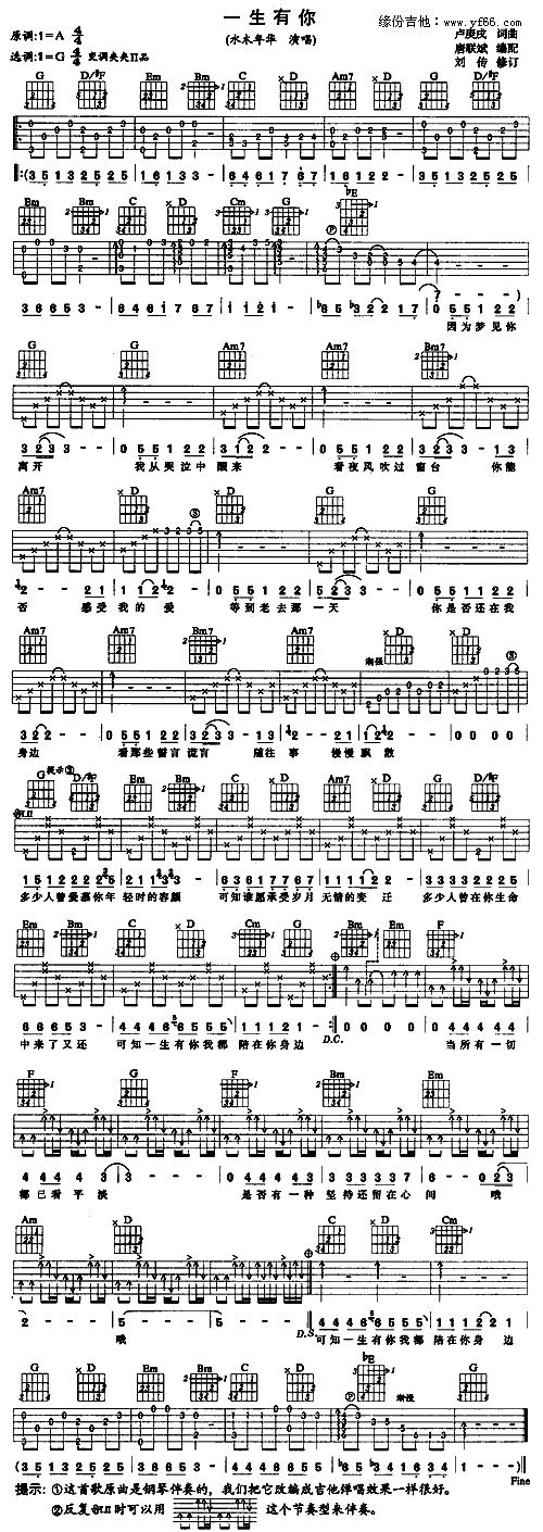 《水木年华《一生有你吉他谱》(G调)》内容来自于互联网,不能保证内容的准确性与完整性,仅供学习交流欣赏,请勿用于其它用途,内容版权归原作者及来源网站所有,如有侵犯到您的权益请来信告知,我们将及时删除。