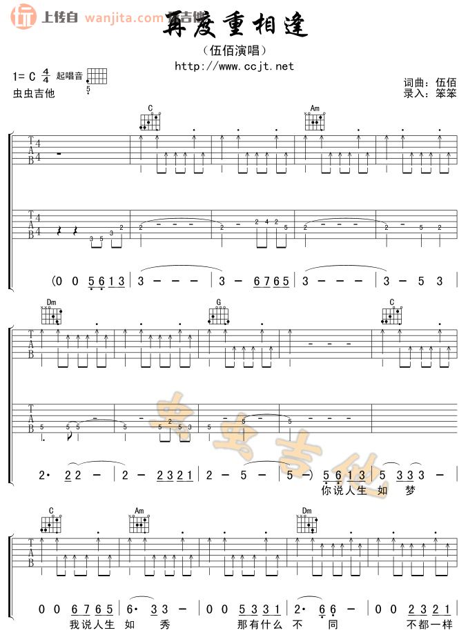 《虫虫《再度重相逢吉他谱》(C调)》内容来自于互联网,不能保证内容的准确性与完整性,仅供学习交流欣赏,请勿用于其它用途,内容版权归原作者及来源网站所有,如有侵犯到您的权益请来信告知,我们将及时删除。