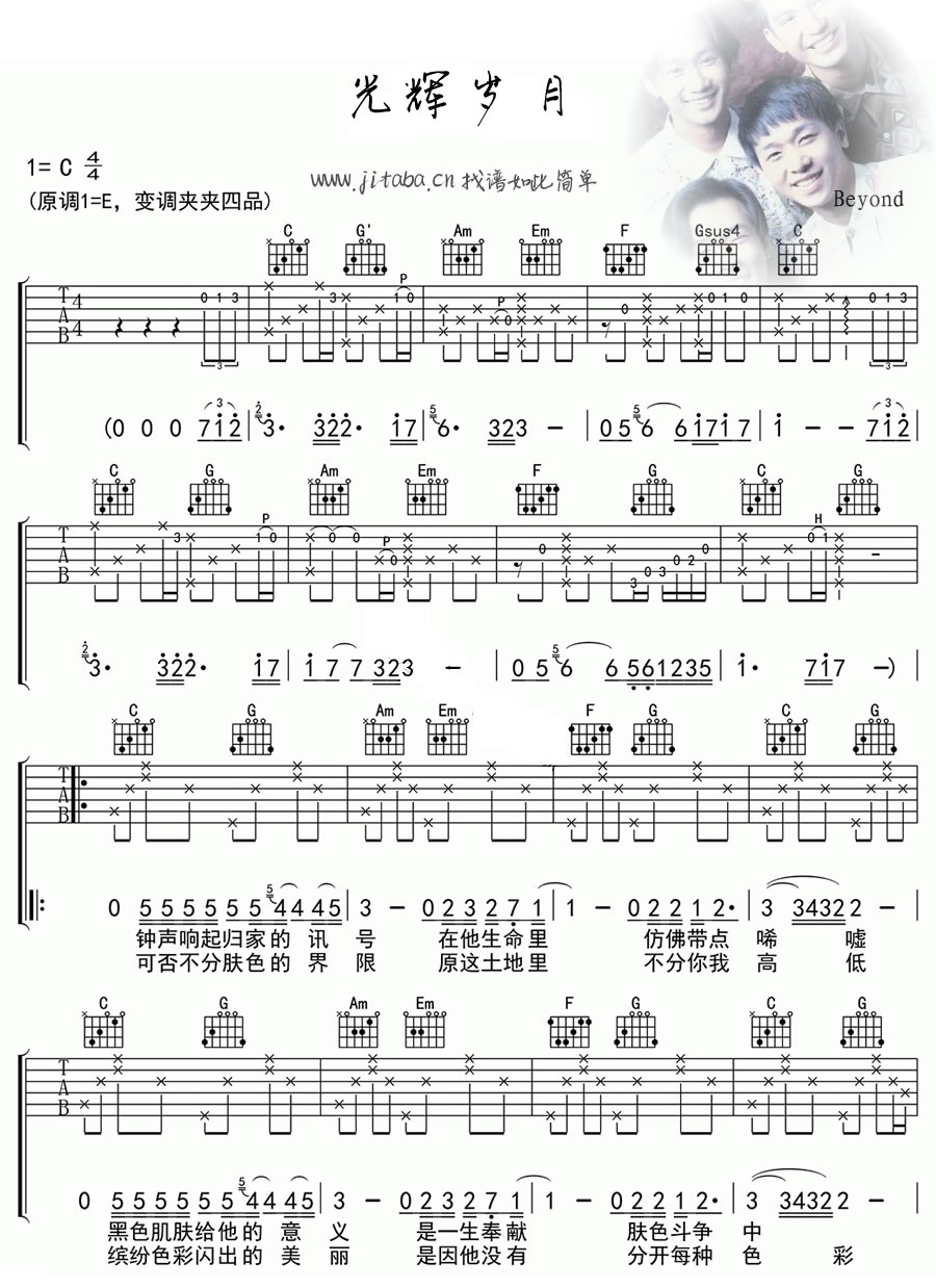 《Beyond《光辉岁月吉他谱》(C调)》内容来自于互联网,不能保证内容的准确性与完整性,仅供学习交流欣赏,请勿用于其它用途,内容版权归原作者及来源网站所有,如有侵犯到您的权益请来信告知,我们将及时删除。