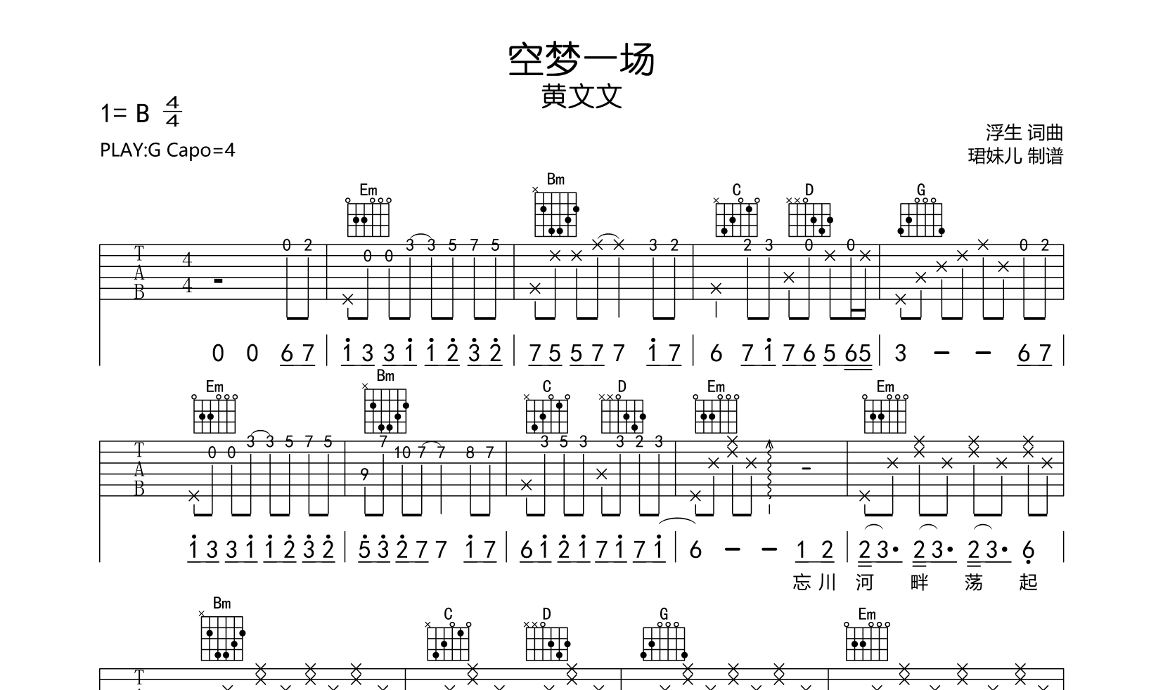 《文文《空梦一场吉他谱》(G调)》内容来自于互联网,不能保证内容的准确性与完整性,仅供学习交流欣赏,请勿用于其它用途,内容版权归原作者及来源网站所有,如有侵犯到您的权益请来信告知,我们将及时删除。