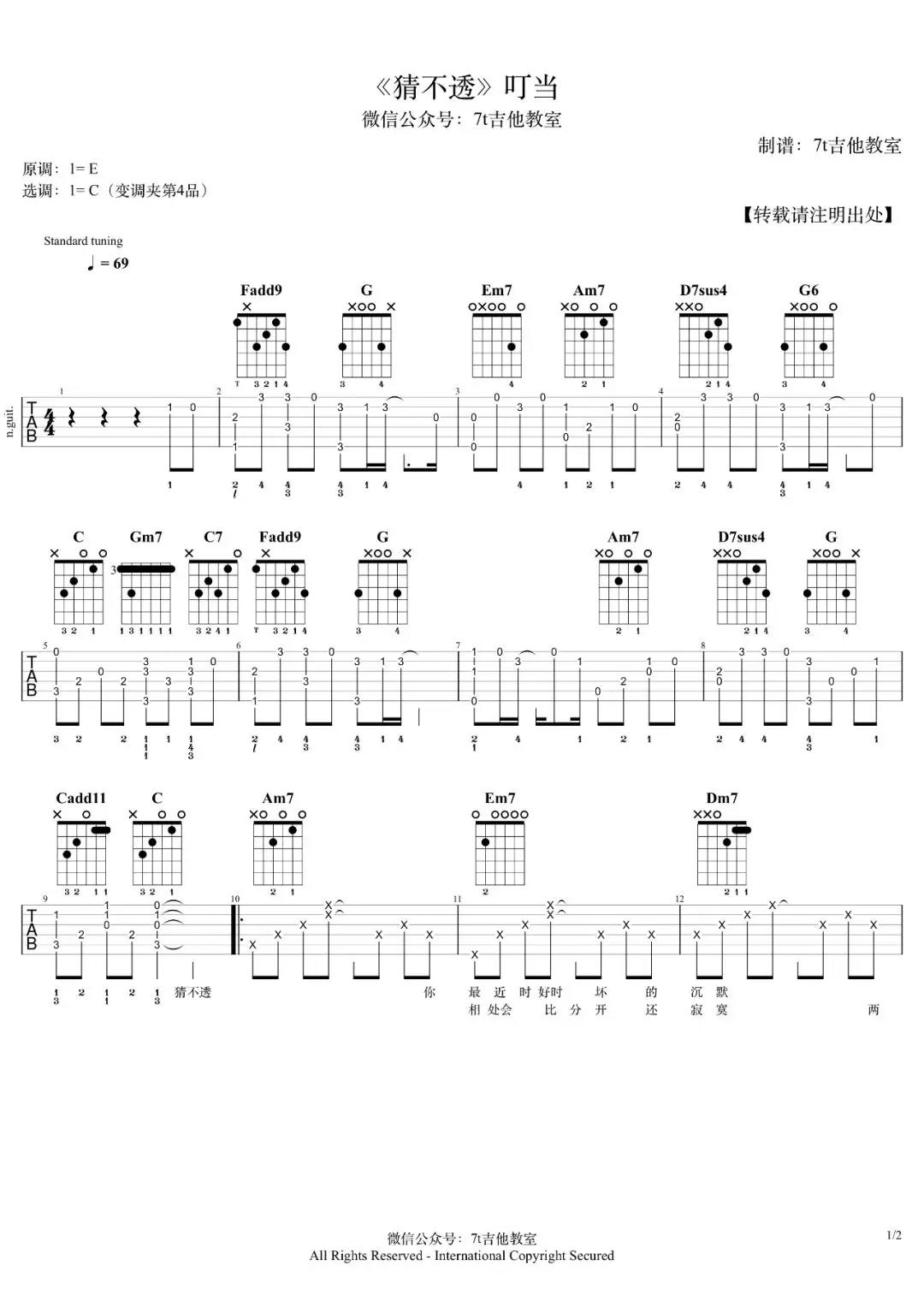 《丁当《猜不透吉他谱》(C调)》内容来自于互联网,不能保证内容的准确性与完整性,仅供学习交流欣赏,请勿用于其它用途,内容版权归原作者及来源网站所有,如有侵犯到您的权益请来信告知,我们将及时删除。